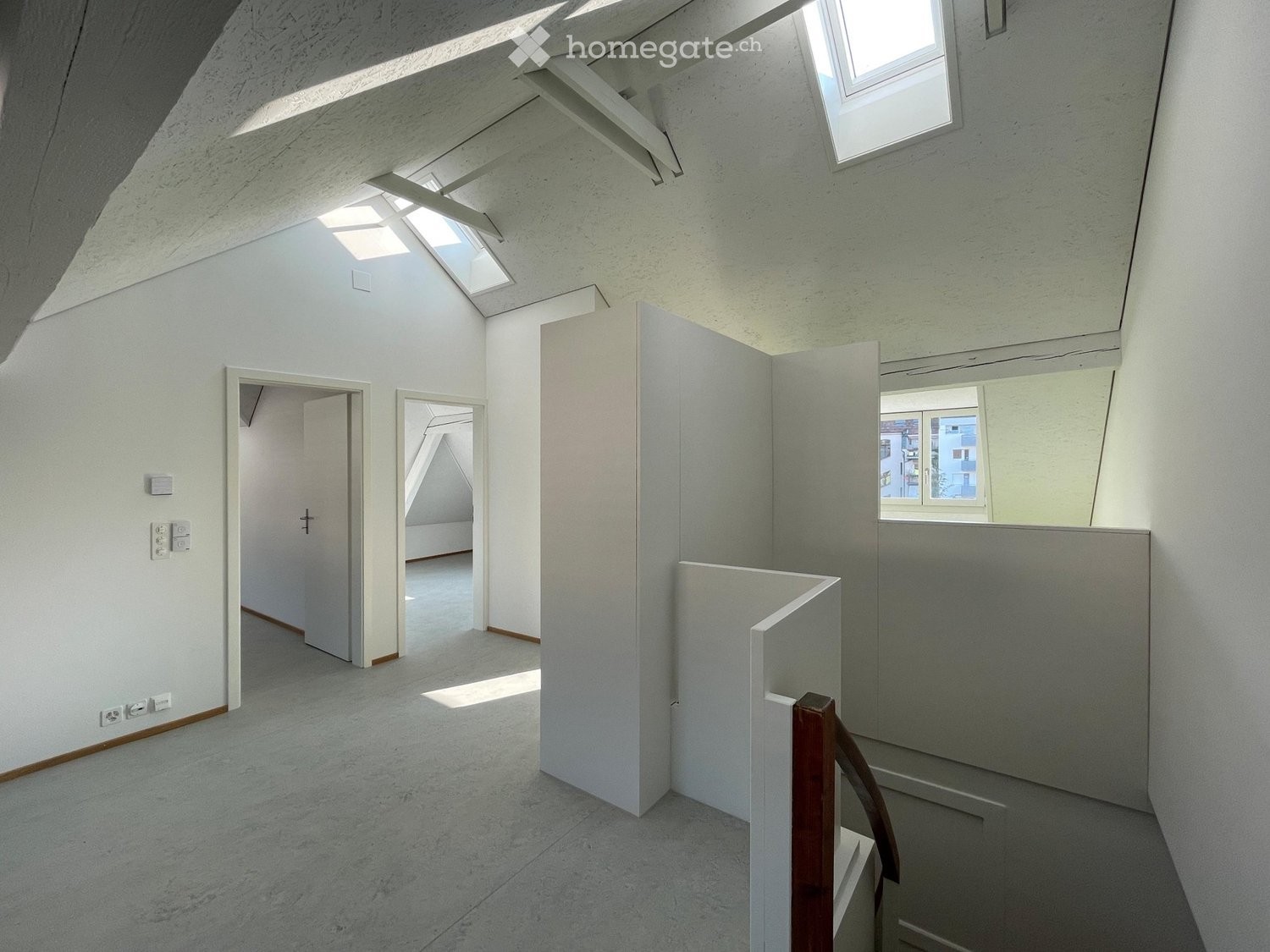 Helle Wohnräume: Weiße Wände, Fenster und Dachfenster schaffen eine einladende Atmosphäre.