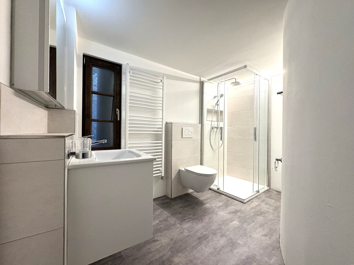 Zeitgemässes Bad: Elegantes Badezimmer mit moderner Dusche und hochwertigen Armaturen.