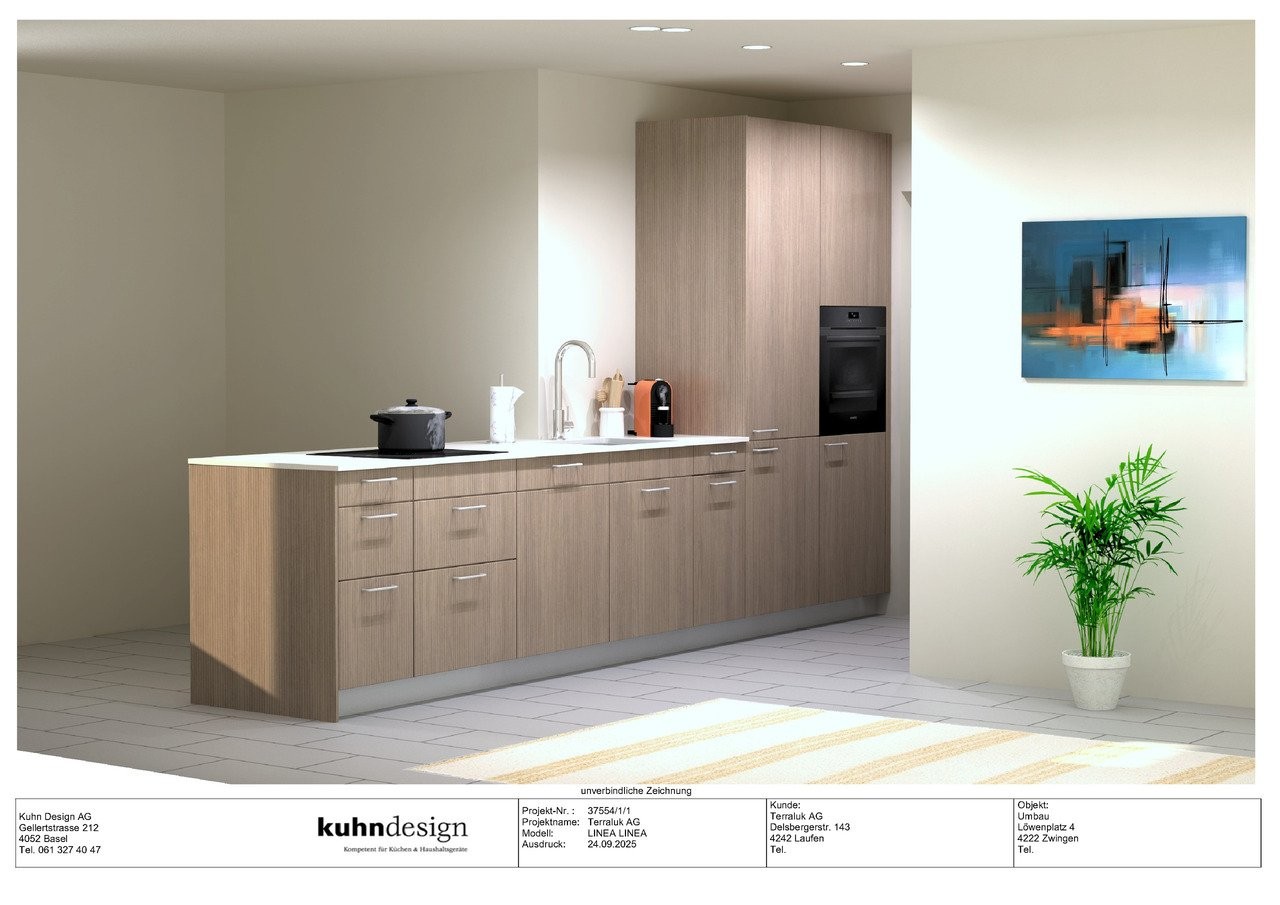 Im Erdgeschoss befinden sich der Eingangsbereich mit separater Gästetoilette sowie einem Waschturm. Die offene Küche fügt sich fliessend in den grosszügigen Wohn- und Essbereich ein und wird durch einen erweiterten Anbau mit kleinem Sitzplatz ergänzt.