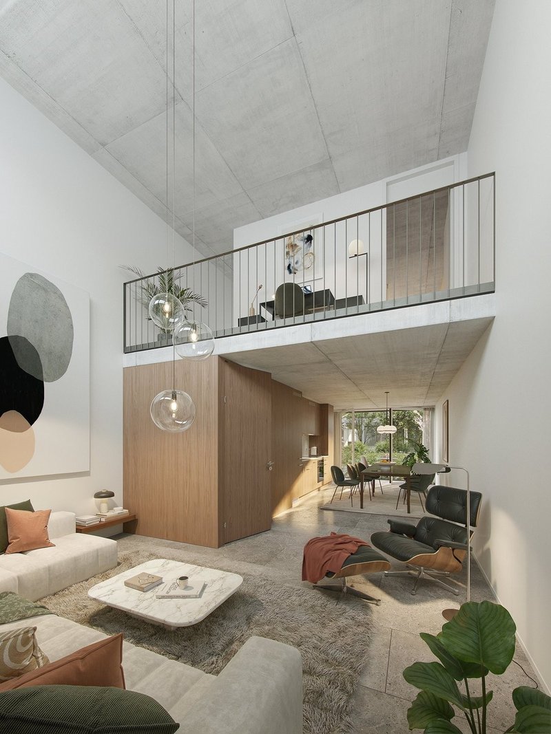 Die exklusiven Atelier-Wohnungen bieten eine besondere Wohnform auf zwei Ebenen mit überhohem Wohnraum mit einer Raumhöhe von rund 5 m. Grosse Fensterflächen im oberen Bereich fluten die Räume mit Tageslicht und unterstreichen den offenen Charakter dieser Wohnungen.