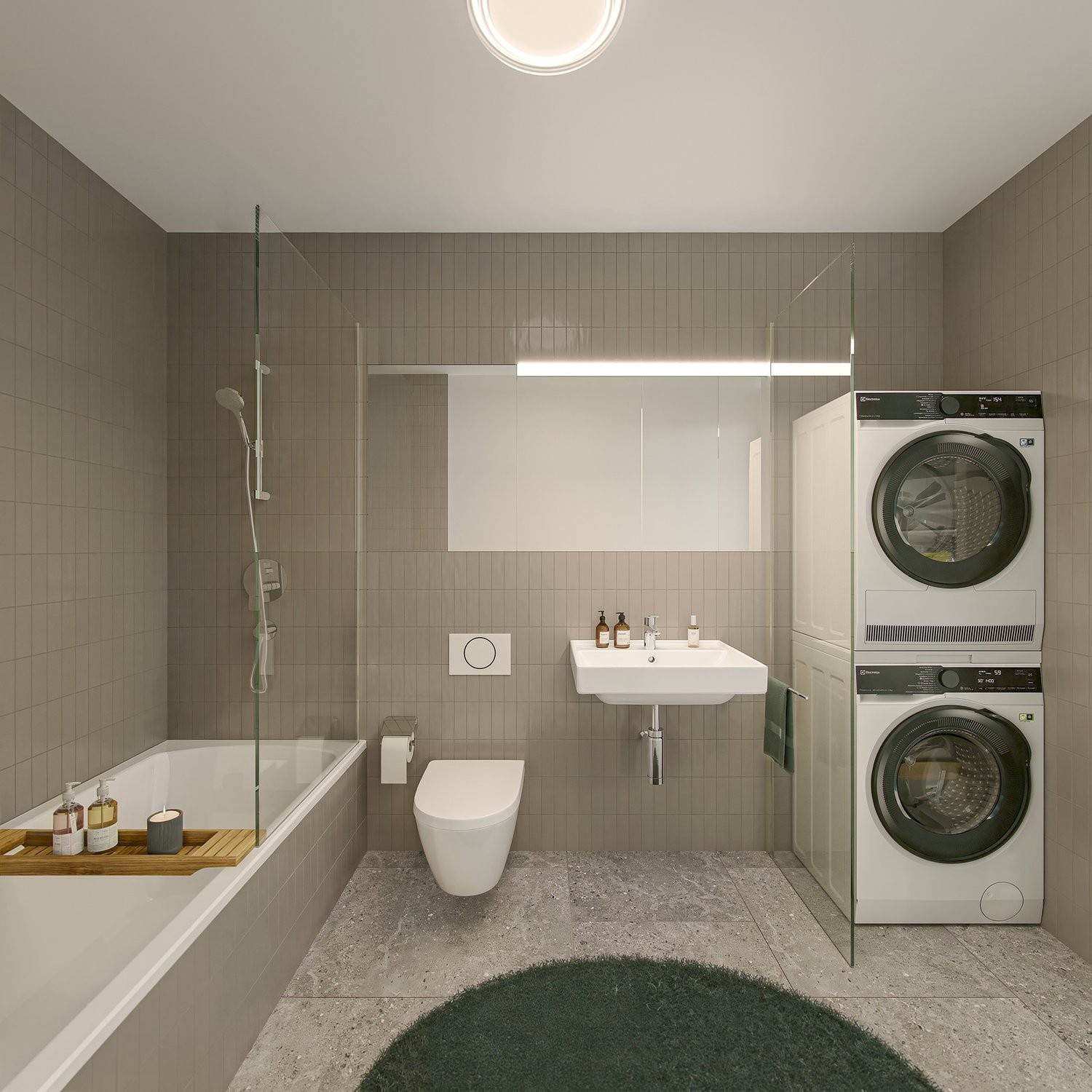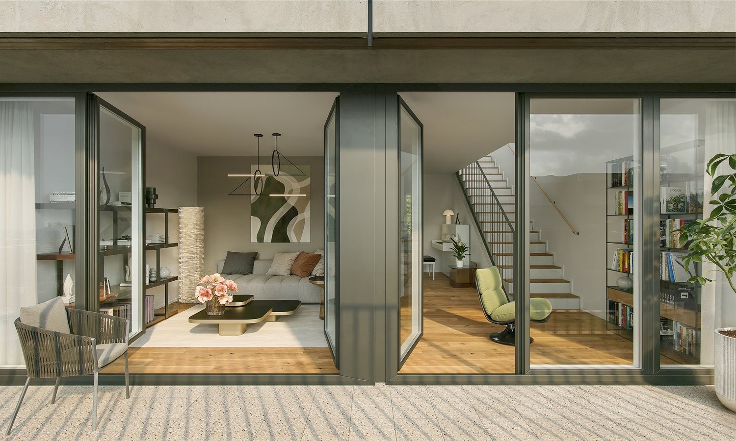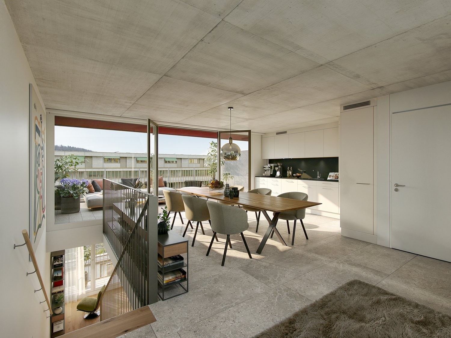 Die exklusiven und besonderen Grand-Attika-Wohnungen liegen im obersten Geschoss und vereinen Grosszügigkeit, Privatsphäre und eine hohe Aussenraumqualität. Im oberen Geschoss liegen die Küche mit Essbereich sowie eine Gästetoilette. Direkt vorgelagert befindet sich eine weitläufige Terrasse, die den Essbereich nach draussen erweitert.