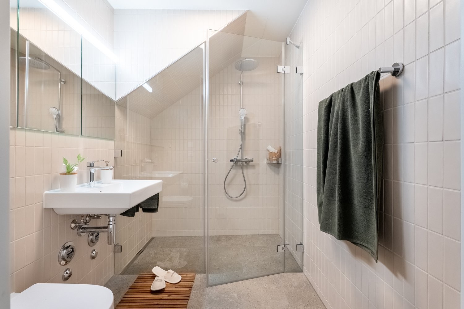 Die exklusiven Attika-Wohnungen erstrecken sich über zwei Geschosse und bestechen durch ein grosszügiges Raumgefühl. Grosszügige Fensterflächen sorgen für lichtdurchflutete Räume und eine offene, einladende Wohnatmosphäre. Im unteren Geschoss befinden sich die Küche mit Essbereich, ein Zimmer sowie eine Nasszelle. Das Herzstück der Wohnung liegt im oberen Geschoss und bietet einen offenen Wohnbereich, ein zusätzliches Zimmer und eine grosszügige Terrasse, die den Wohnraum nach draussen erweitert.
