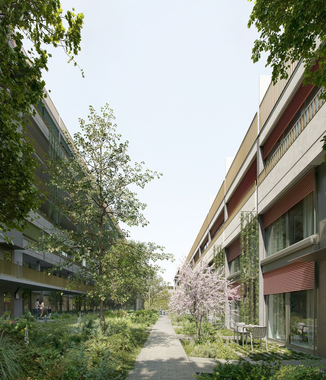 Urbane Symbiose: Die vertikale Begrünung der Gebäude und die direkte Lage am Überlandpark schaffen eine einzigartige Verbindung aus modernem Stadtleben und erholsamen Grünflächen.