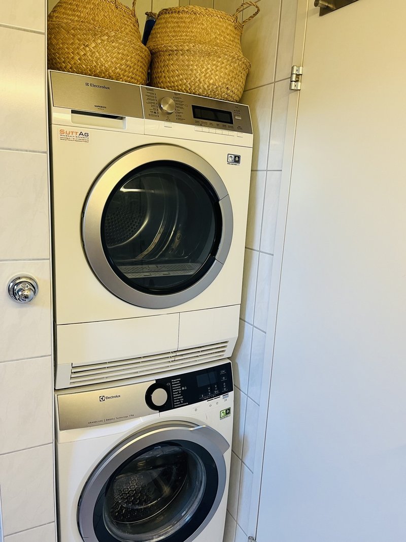 Badezimmer mit eigener Waschmaschine und Trockner.