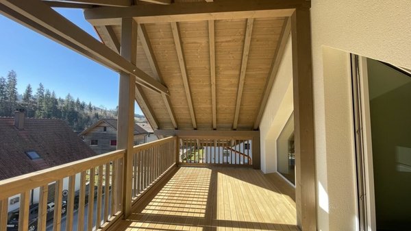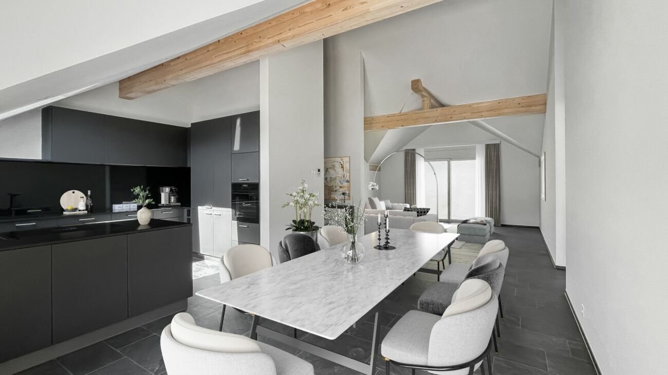 Der Essbereich kann in die offene Küche integriert werden, was eine offene und einladende Atmosphäre schafft. Von der Küche aus gelangt man direkt auf den grosszügigen Balkon.