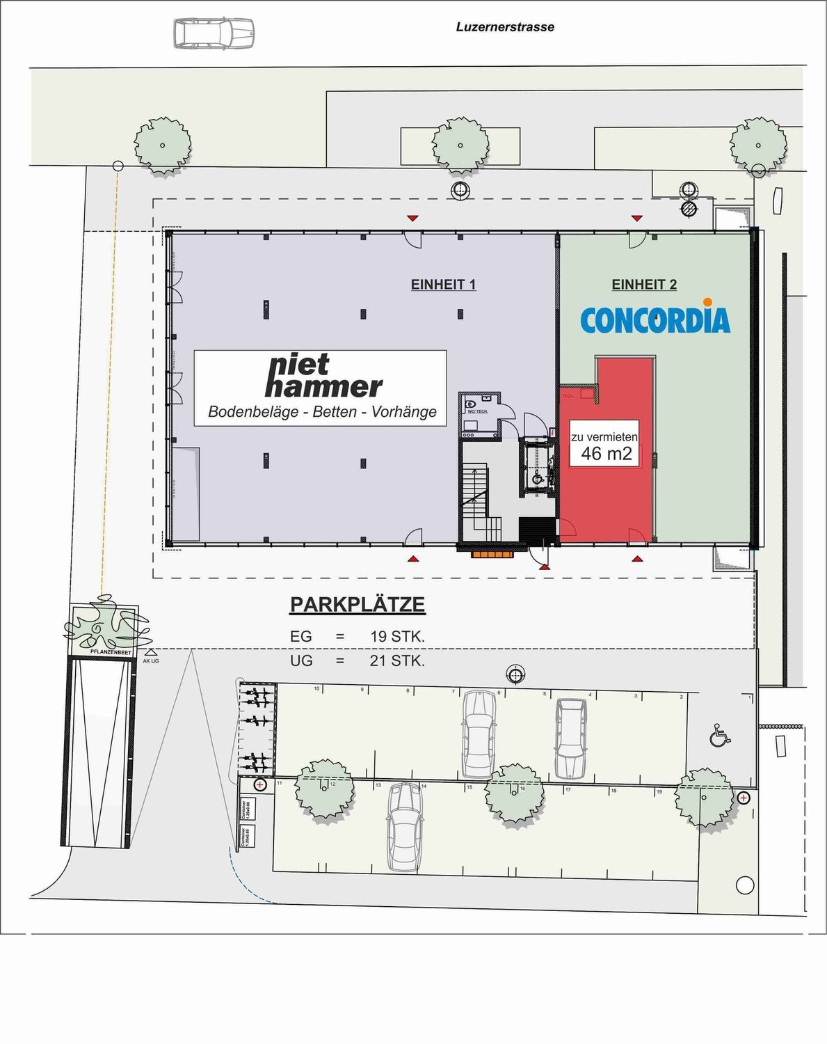 Ein weiterer Pluspunkt der Liegenschaft ist die zentrale Lage mit sehr guter Erschliessung mittels ÖV und Auto. Zudem hat es vor dem Gebäude Aussenparkplätze für die Kundschaft des Gewerbehauses.