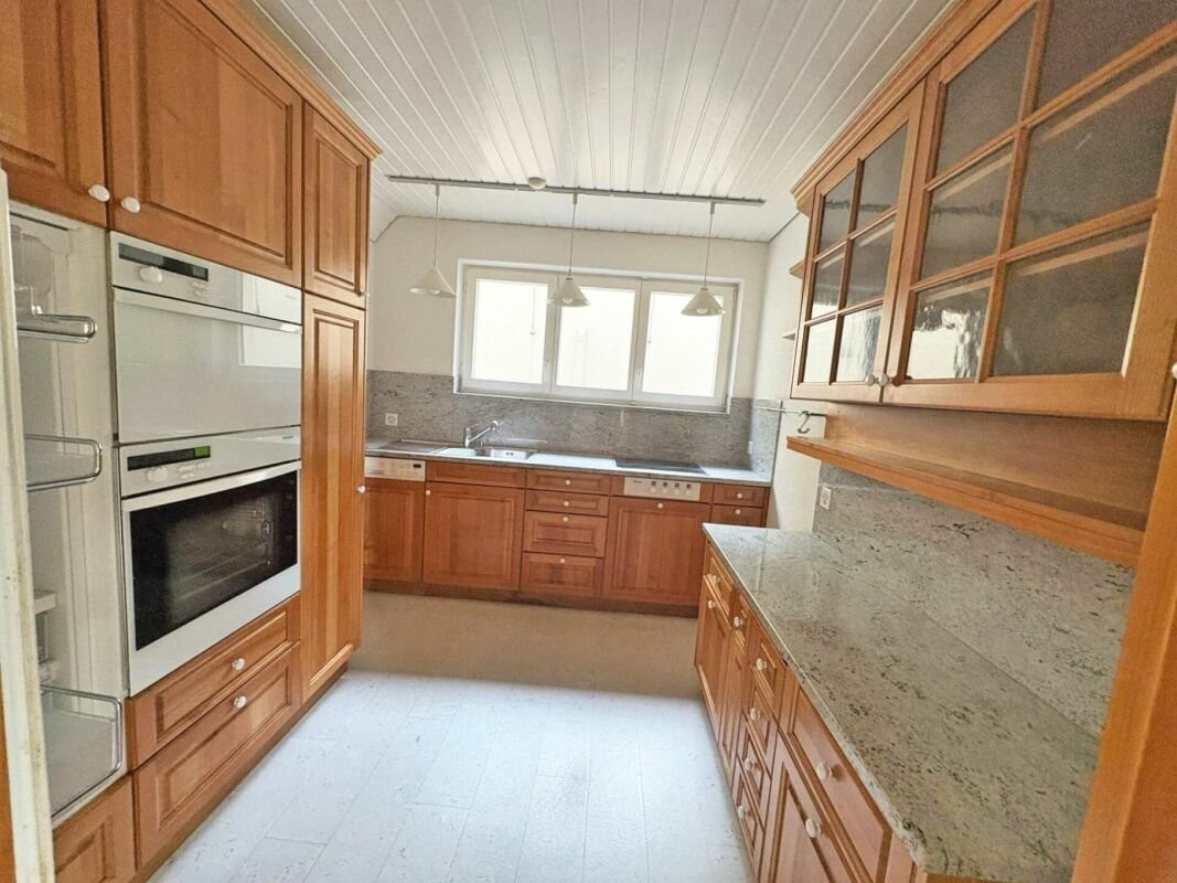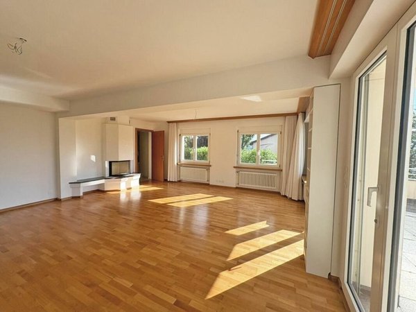 Der Zugang zu der Wohnung erfolgt vom Hof aus über eine elegante Aussentreppe. Der überdachte Eingangsbereich mit dem nach Südwesten ausgerichteten Sitzplatz lädt bereits beim Eintreten zum Verweilen ein. Im Jahr 2013 wurde die neue Eingangstür mit seitlichen Fensterelementen eingebaut, wodurch der Eingangsbereich zusätzlich an Helligkeit und Modernität gewonnen hat. Das vorgelagerte Granitpodest wird abends stimmungsvoll durch ein LED-Band von unten beleuchtet und sorgt für ein einladendes Ambiente. Das grosszügige Entrée empfängt Bewohner und Gäste freundlich und gewährt Zugang zu fast allen Räumen der Wohnung, einschließlich der Gästetoilette und des Gästebads. Die Küche ist funktional gestaltet und verfügt über ein angrenzendes, grosses Reduit, welches praktischen Stauraum bietet. Das Eltern Schlafzimmer punktet mit einem eigenen Badezimmer, das Privatsphäre und Komfort vereint. Vor dem Wohnzimmer erstreckt sich eine weitläufige Terrasse über den Garagen, die ideal zum Entspannen oder für gesellige Stunden im Freien geeignet ist. Das warme Kirschbaumholz-Parkett verleiht den Wohnräumen eine behagliche Atmosphäre und unterstreicht den hochwertigen Charakter der gesamten Wohnung.