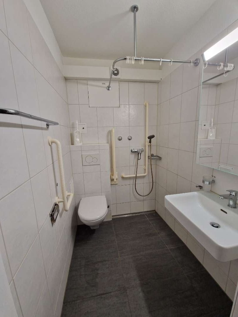 Badezimmer: Mit weissen Fliesen, Keramikspüle, Handbrause und Spiegel mit Handtuchhalter