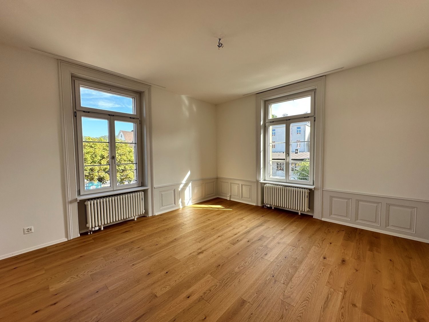 Durch die behutsame Sanierung entsteht eine harmonische Verbindung von modernem Komfort und charmantem Ambiente. Die grosszügigen, hohen Räume, die mit eleganten Eichenparkettböden ausgelegt sind, schaffen eine behagliche und einladende Wohnatmosphäre, in der man sich sofort zuhause fühlt.