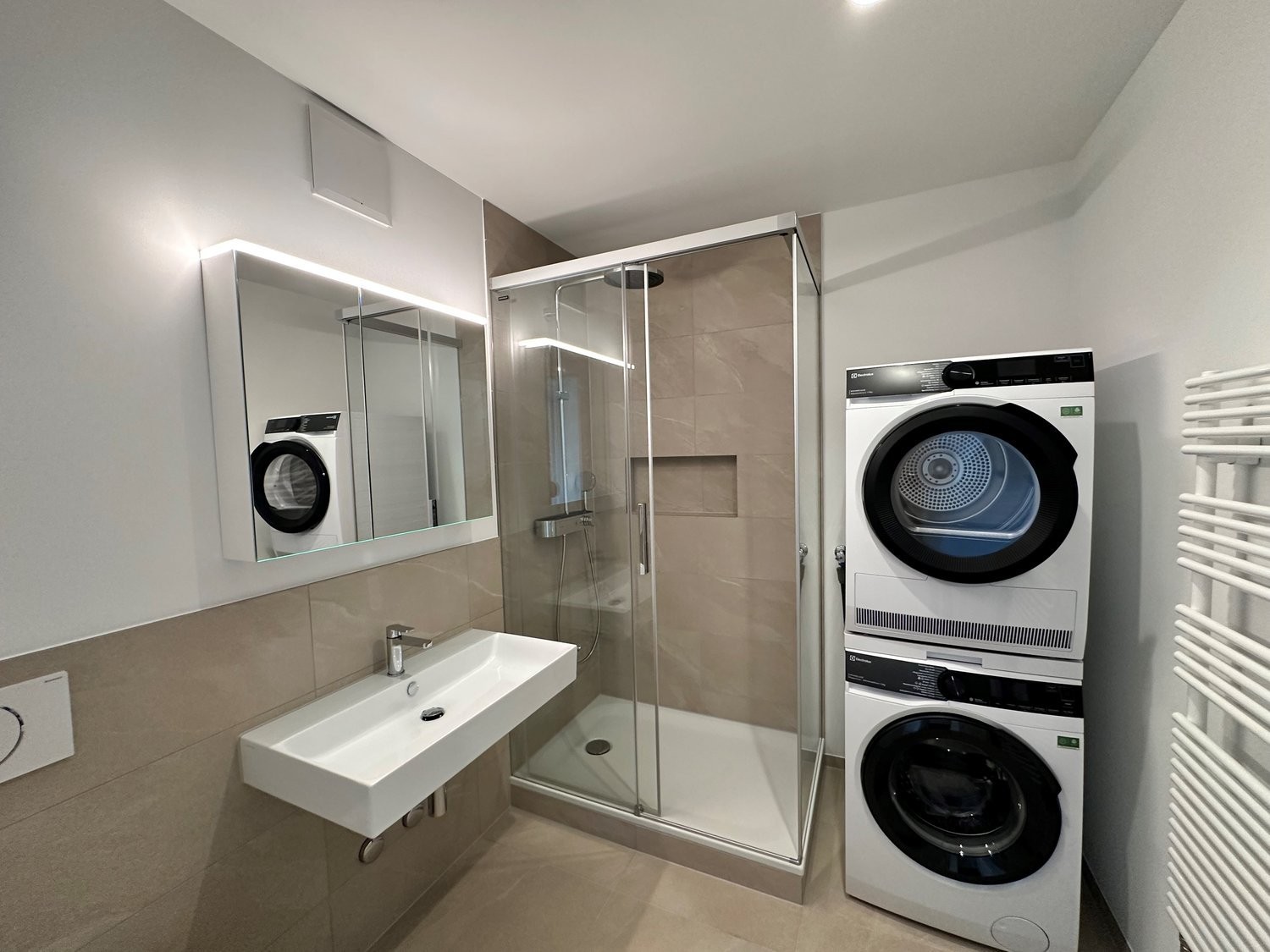 Diese Wohnungen verfügen über je zwei moderne Nasszellen. Die eine Nasszelle ist mit einer grosszügigen Dusche ausgestattet und die Andre verfügt über eine Badewanne, die zum Entspannen einlädt. Jede Wohnung ist zudem mit einer eigenen Waschmaschine und einem Tumbler ausgestattet, die bei Bedarf durch eine Schiebetür aus dem Sichtfeld verschwinden und somit für zusätzlichen Komfort sorgen.