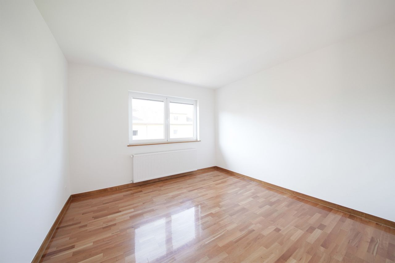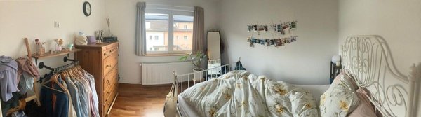 Das Zimmer ist 13 m² mit Parkett und grossen Fenstern nach Süden, im 1. OG unserer Doppelhaushälfte.