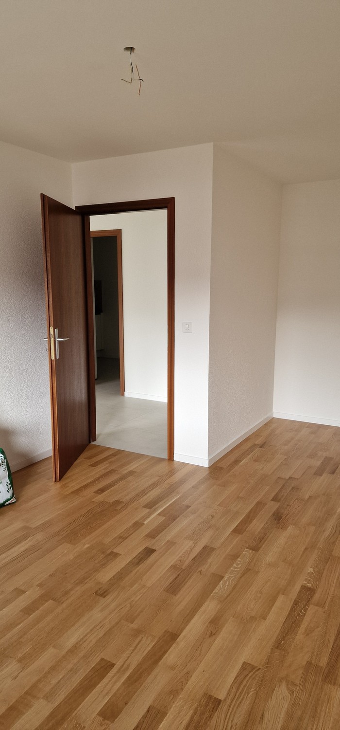Dernier étage, logement de 2.5 pièces (60m2), avec place de parc ext. Entièrement rénové, 1 chambre, cuisine neuve, séjour, long balcon, cave, parquet, buanderie commune.
