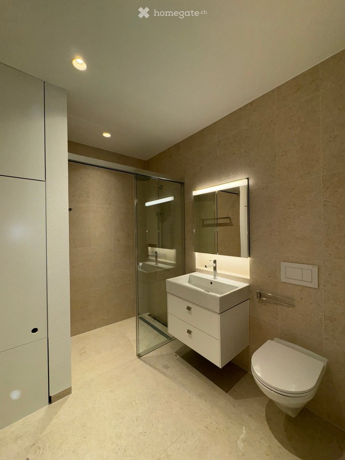 Vollständig möblierte Neubauwohnung mit Parkettboden, Doppelbett, Esstisch, Designersofa und Schrankraum. Selbstverständlich ausgestattet mit