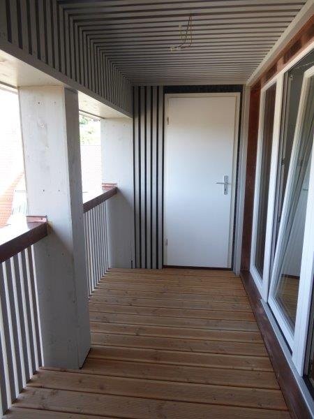 Privater Balkon: Holzboden und weisse Geländer mit herrlicher Aussicht über die Stadt