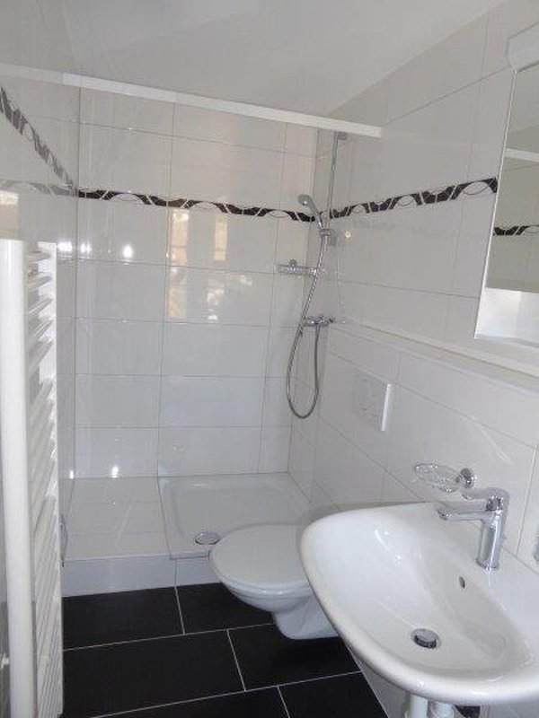 Stilvolles Badezimmer: Modern gestaltet mit weissen Fliesen und schwarzen Akzenten