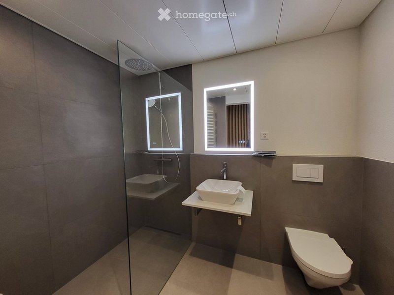 Modernes Bad mit begehbarer Regendusche, WC, Lavabo und Handtuchradiator
