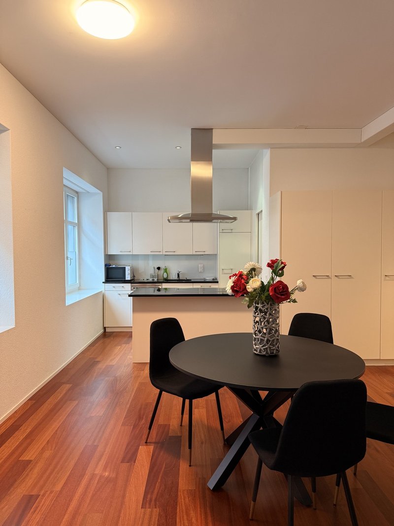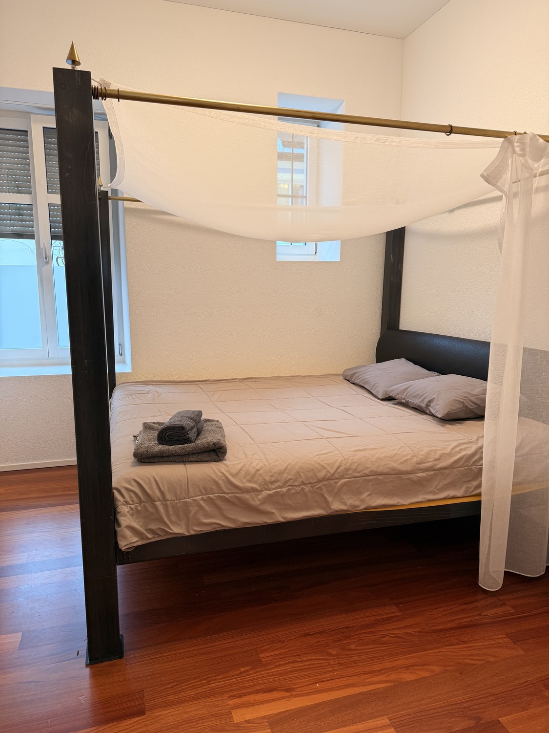 Voll möblierte Wohnung mit Himmelbett. Moderne Küche mit Kochinsel und V-Zug-Küchengeräten, vollständig ausgestattet mit Kücheninventar. Inklusive Mikrowelle und Kaffeemaschine.