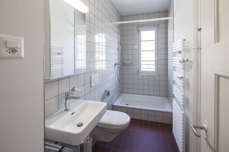 Badezimmer mit Stehdusche, WC, Lavabo und Plattenboden