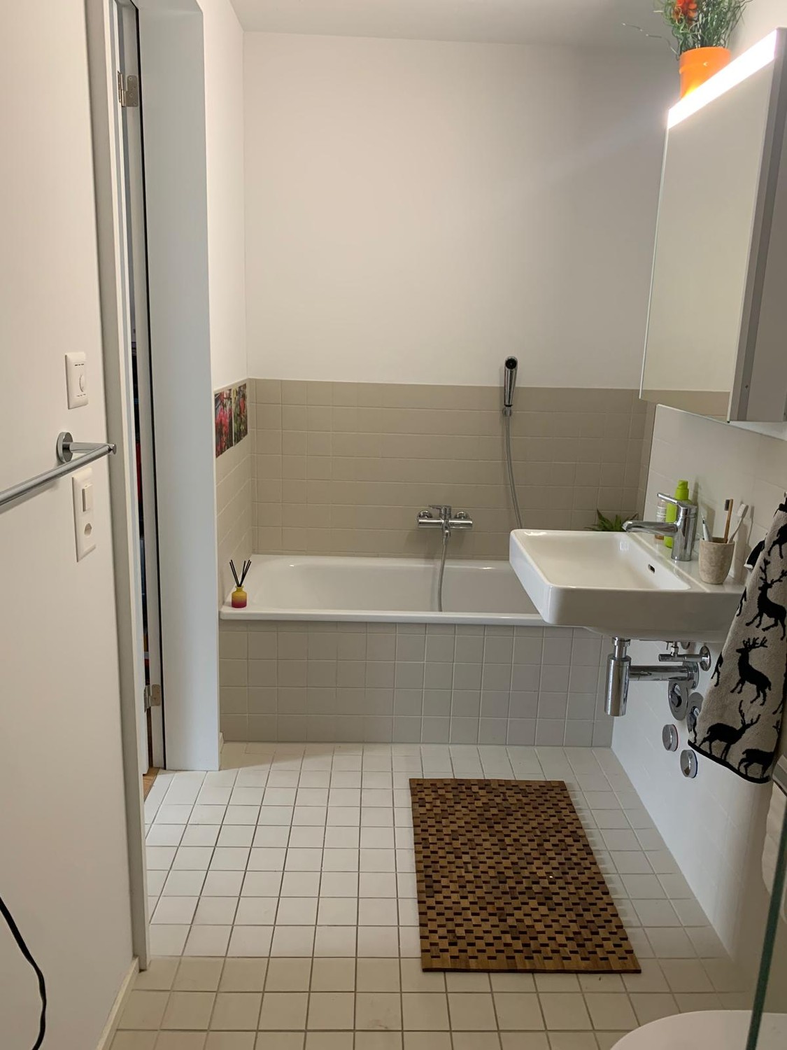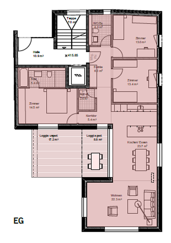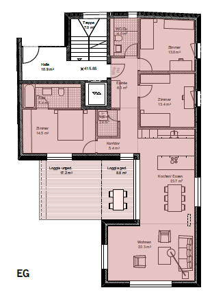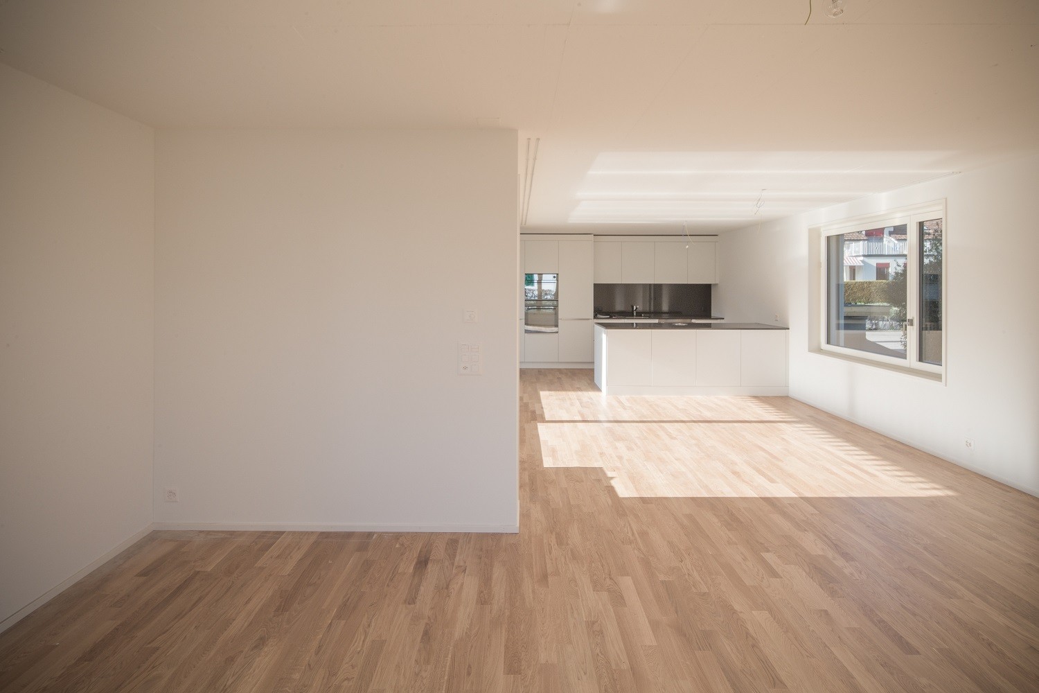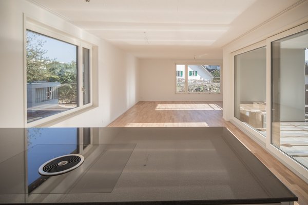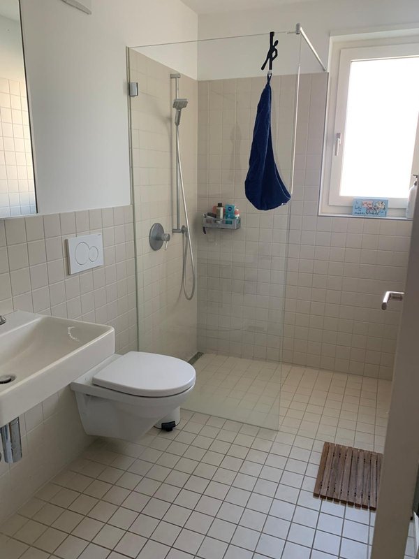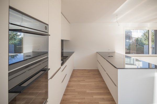 Die Wohnung verfügt über eine moderne Küche inkl. Kochinsel und Steamer. Der grosszügige Balkon erweitert den Wohnbereich optimal. Die Küche ist mit den modernsten Electrolux Geräten und Induktionsherd ausgestattet. Waschmaschine und Tumbler sind in einem separaten Reduit fix installiert. Rechts vom Eingang befindet sich eine Einbaugarderobe. Die beiden Nasszellen (WC/Dusche und WC/Dusche/Badewanne) sind mit Keramikplatten, die Schlafzimmer mit Parkettboden bestückt. Ein geräumiges Kellerabteil steht zur Verfügung und Tiefgaragenplätze können für CHF 160 pro Monat dazu gemietet werden. Zudem ist ein gemeinschaftlich nutzbarer Abstellraum für Fahrräder vorhanden. Ein Lift erschliesst sämtliche Etagen des Hauses von der Garage bis zur obersten Wohnung.