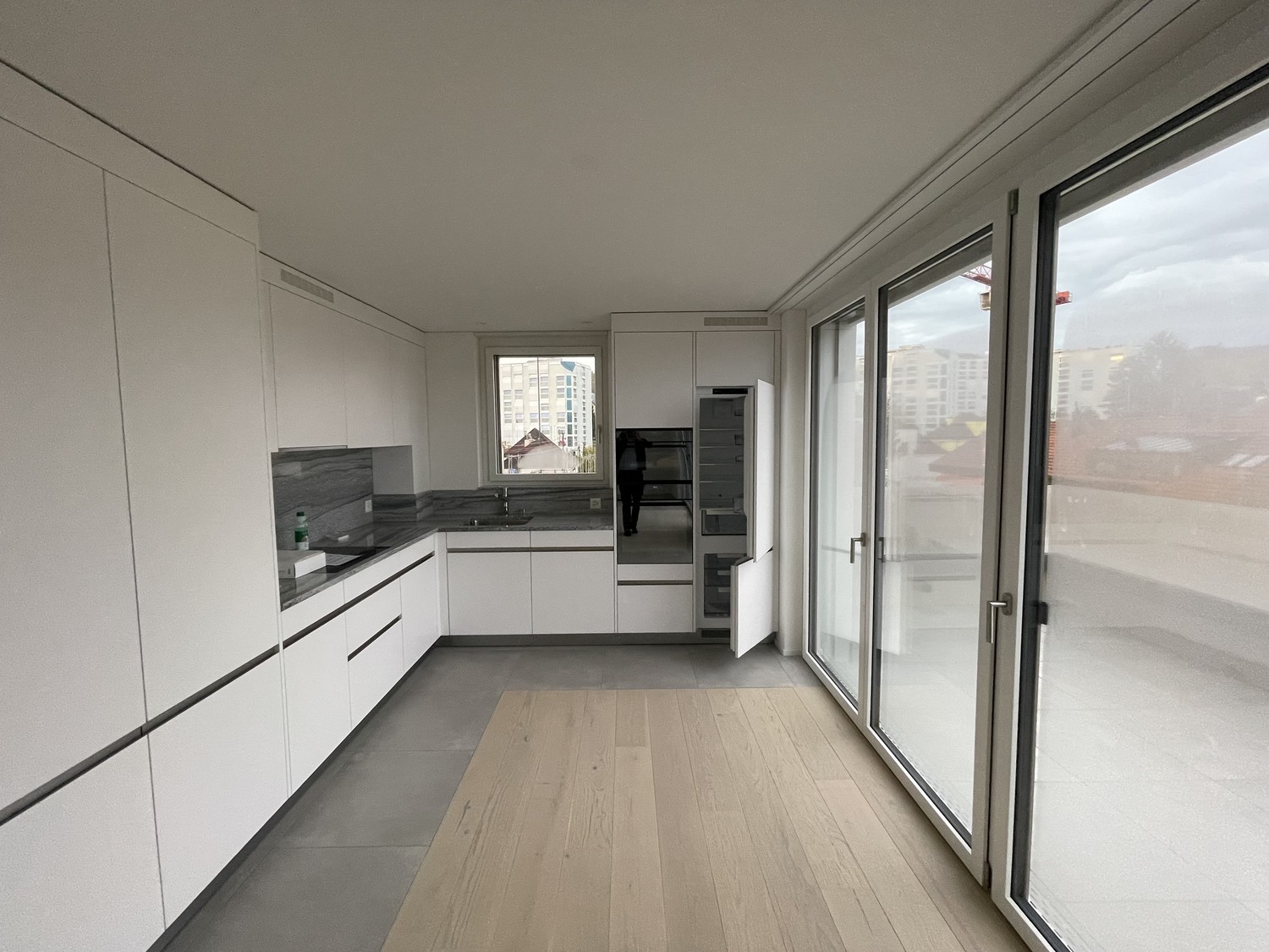 Offene Küche: Modern ausgestattet mit weissen Schränken, Geschirrspüler, Kühlschrank und grossen Glasfenstern mit herrlicher Aussicht