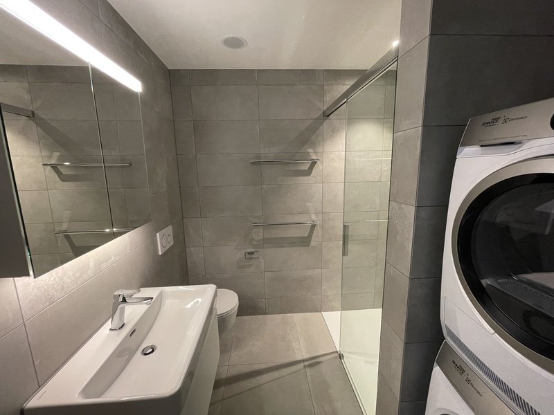 Modernes Badezimmer: Mit Glastür, Waschbecken, WC und eigener Waschmaschine