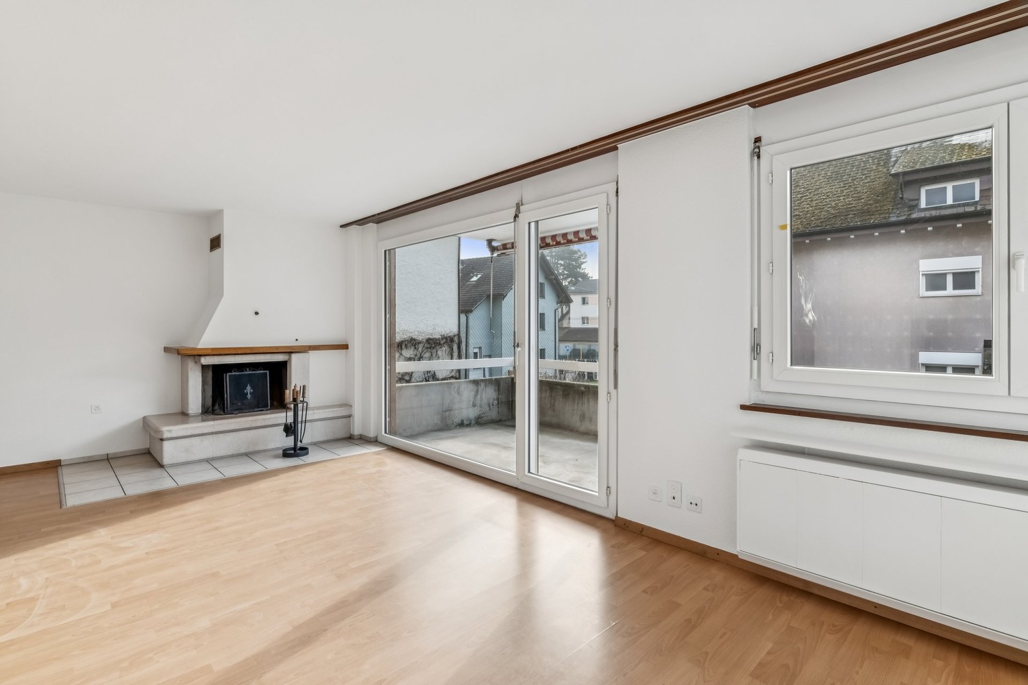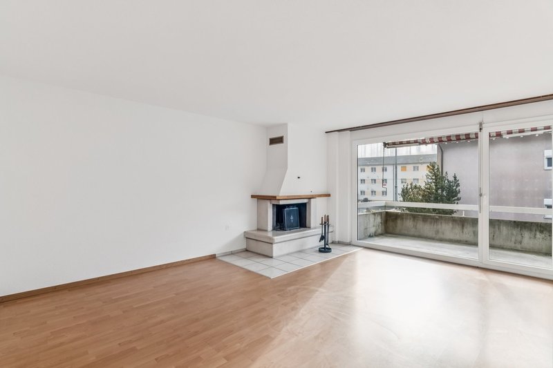 grossflächiger, heller Wohnraum mit Cheminée und Zutritt zum Balkon