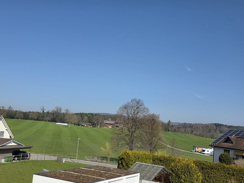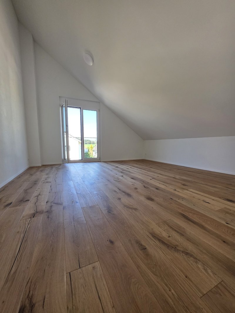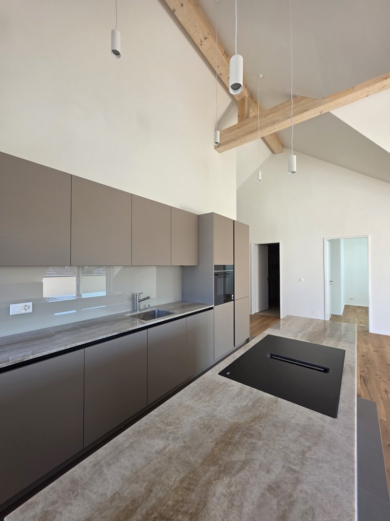 Die beeindruckende Deckenhöhe von bis zu 5.5 Metern mit sichtbaren Holzbalken verleiht der Wohnung Loft-Charakter und eine Atmosphäre, die begeistert. Die Weitsicht ins Grüne und die ruhige Lage machen jeden Tag zu einem kleinen Rückzugsort.