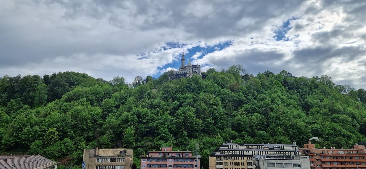 Balkon mit spektakulaerem Blick ueber Stadt und Fluss
