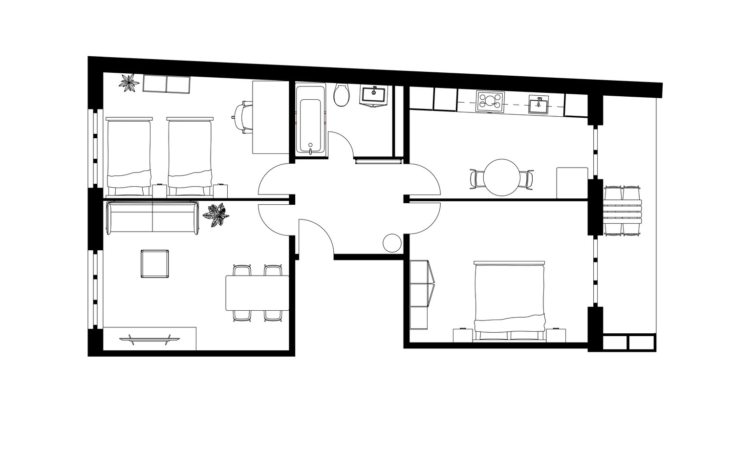 Die Wohnung verfügt über einen geräumigen Eingangsbereich mit einer Garderobe und einem Regal für Schlüssel. Das Wohnzimmer ist für Komfort und Entspannung ausgelegt und verfügt über einen Fernseher. Das große Hauptschlafzimmer hat ein 180 cm breites Bett und einen Kleiderschrank mit direktem Zugang zum Balkon, der auch von der voll ausgestatteten Küche aus zugänglich ist. Die Küche ist mit allem Notwendigen ausgestattet und verfügt auch über eine Waschmaschine und einen Trockner. Das Gebäude verfügt über einen Aufzug, so dass Sie die Wohnung auch mit Gepäck oder Einkäufen bequem erreichen können.