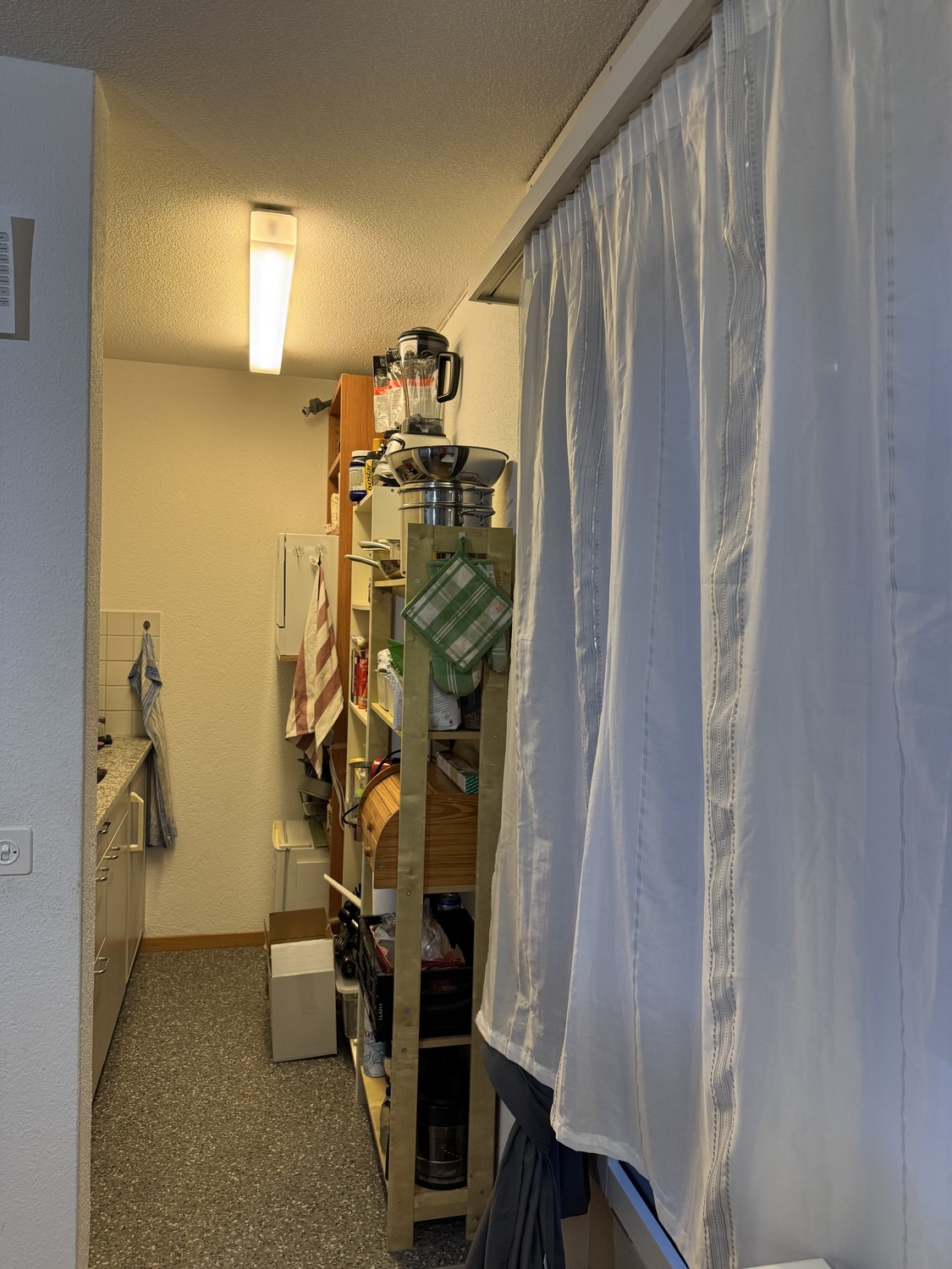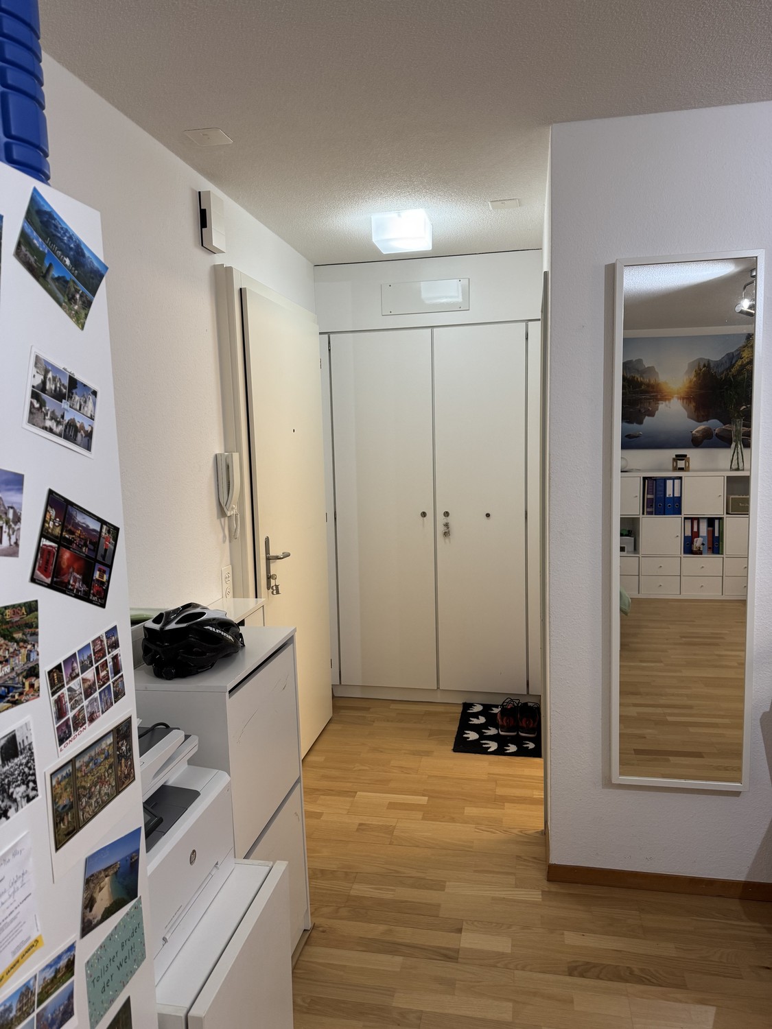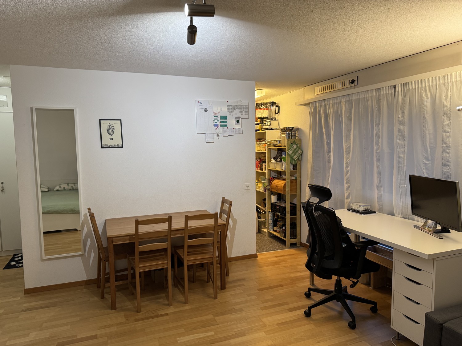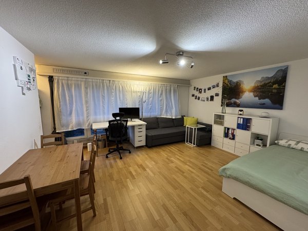 Die Einzimmerwohnung verfügt über einen Einbauschrank, ein Badezimmer mit Badewanne sowie ein helles und geräumiges Zimmer mit Platz für Kleiderschrank, Regal, Bett, Sofa, Schreibtisch und Tisch. Küche mit Glaskeramikkochfeld und Backofen sowie Möglichkeit, Wandmöbel zu montieren, um den Stauraum zu erweitern. Platz für Gefrierschrank, Mikrowelle und externe Spülmaschine. Privater Kellerraum, kein Balkon, gemeinschaftliche Waschküche. Auf Wunsch kann ein Garagenparkplatz dazu gemietet werden.