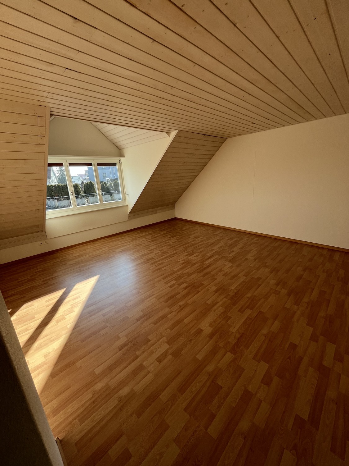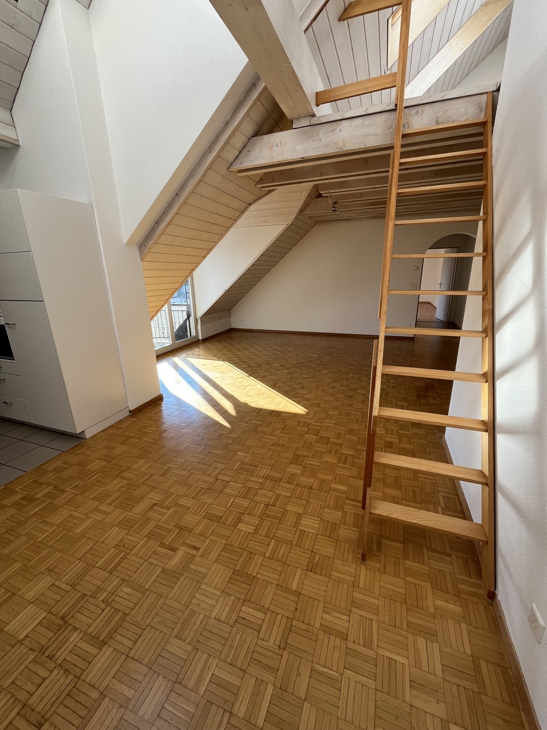 Helle Räume: Holzparkettböden und grosse Fenster sorgen für eine warme, einladende Atmosphäre mit viel Sonnenlicht