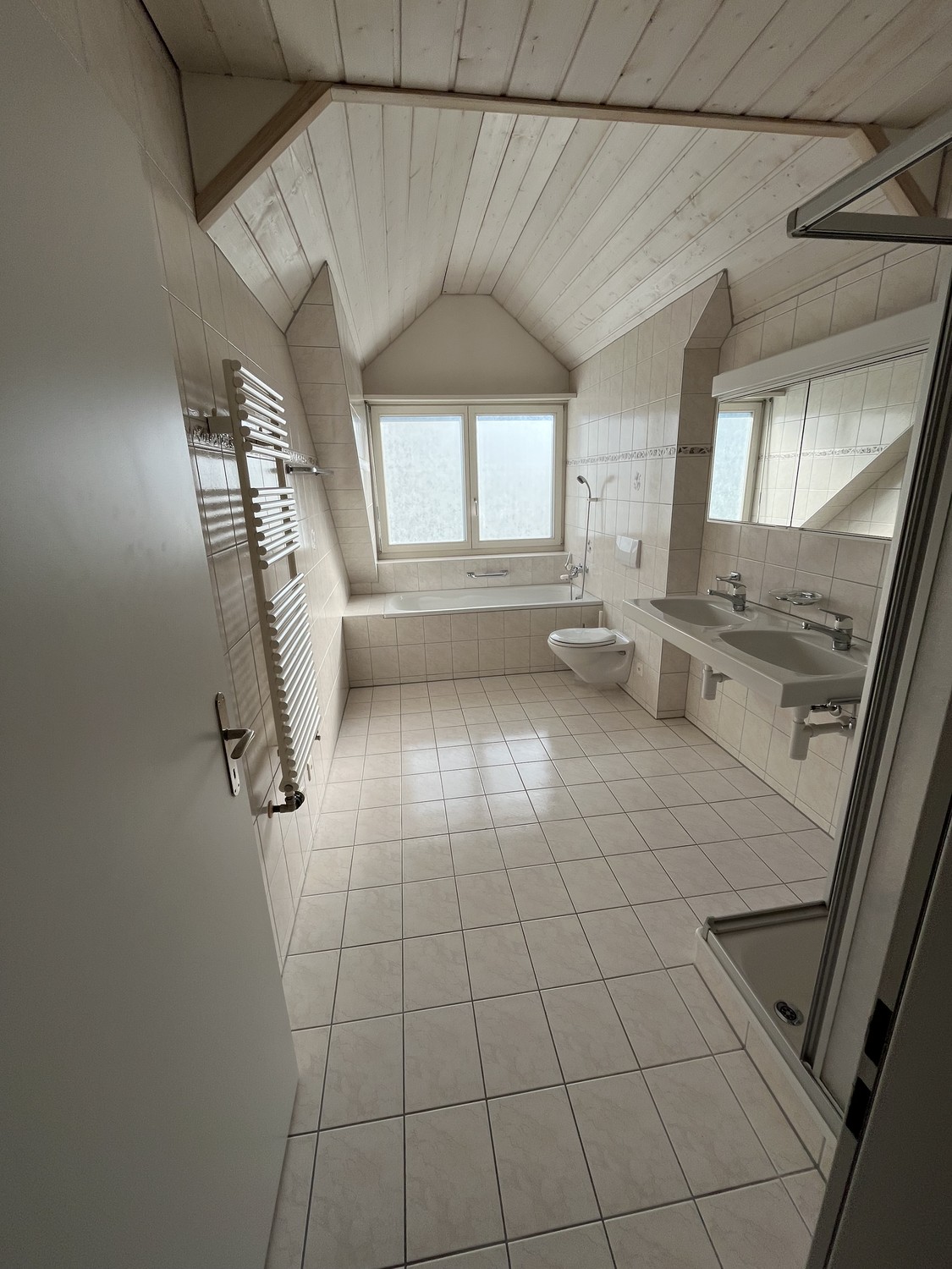 Modernes Badezimmer: Ausgestattet mit Badewanne, Dusche, zwei Waschbecken, WC und Handtuchwärmer