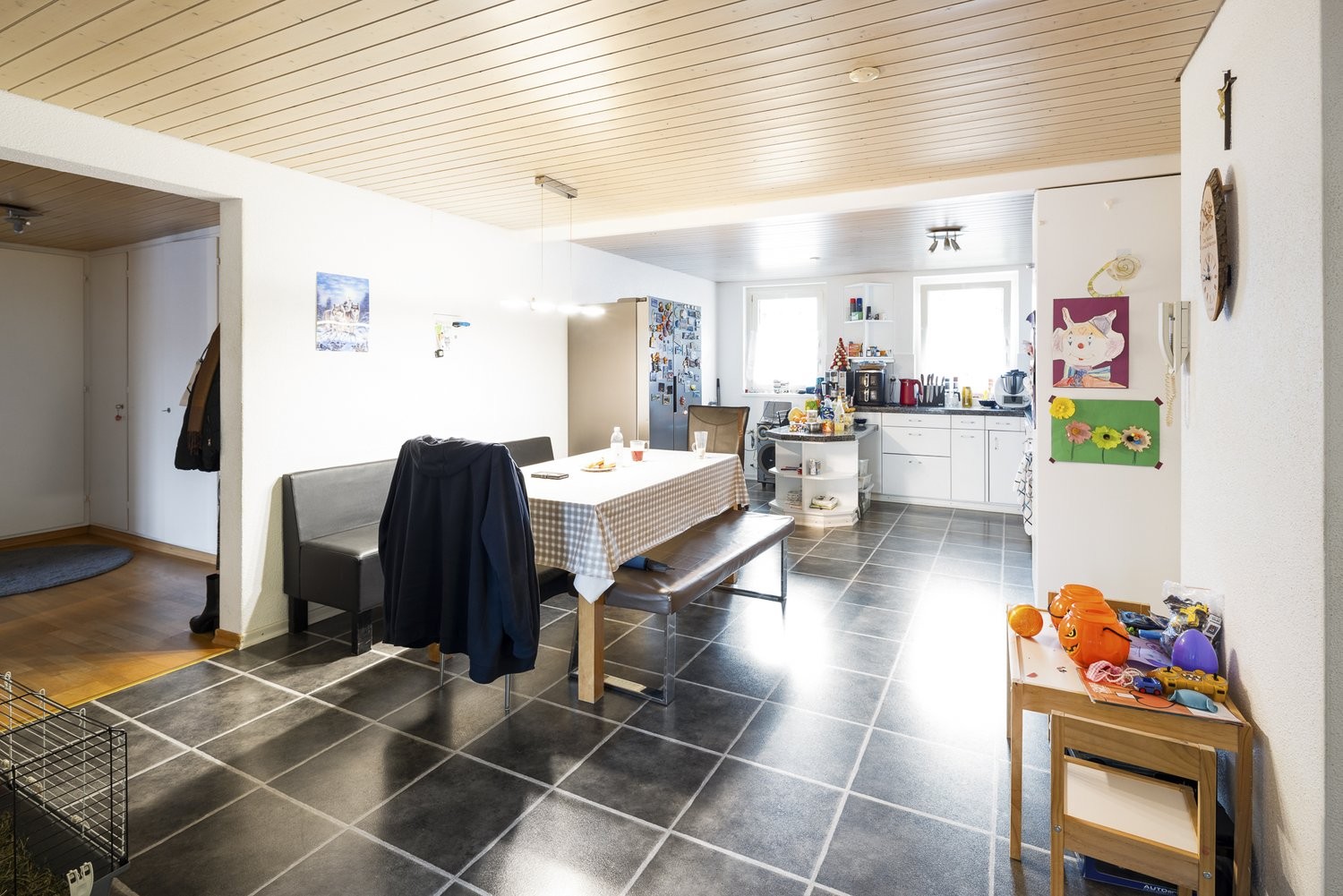 Im Obergeschoss liegt die 4.5-Zimmerwohnung, die ebenfalls vermietet ist. Sie überzeugt mit einer grosszügigen Küche, drei Schlafzimmern und einem Wohnzimmer. Die Nasszelle ist mit Badewanne und Toilette ausgestattet. Hinter dem Haus steht dieser Einheit ausserdem ein Grillplatz zur Verfügung.