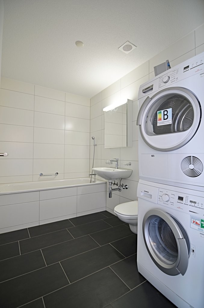 - Badezimmer mit WC, Waschbecken, Spiegelschrank und eigenem Waschturm
