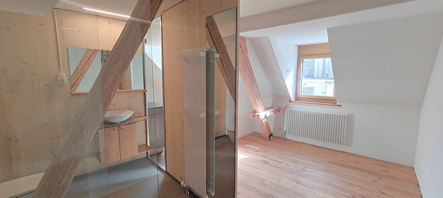 Wir vermieten diese einzigartige, modern konzipierte Stadtwohnung – ideal für urbane Menschen, die Wert auf stilvolles und ästhetisches Wohnen legen. Mit viel Liebe zum Detail wurde das historische Gebäude (Baujahr 1884) aufwendig saniert. Dabei wurde nicht nur so viel wie möglich von der alten Bausubstanz erhalten, sondern diese auch sichtbar gemacht. Kombiniert mit dem modernen und hochwertigen Ausbau verfügt die Wohnung über sehr viel Cachet. Das absolute Highlight dieser Wohnung ist die grosszügige Dachterrasse (ca. 16 m²), von der sich ein unverbaubarer Panoramablick über die Dächer der Stadt in alle Richtungen eröffnet.