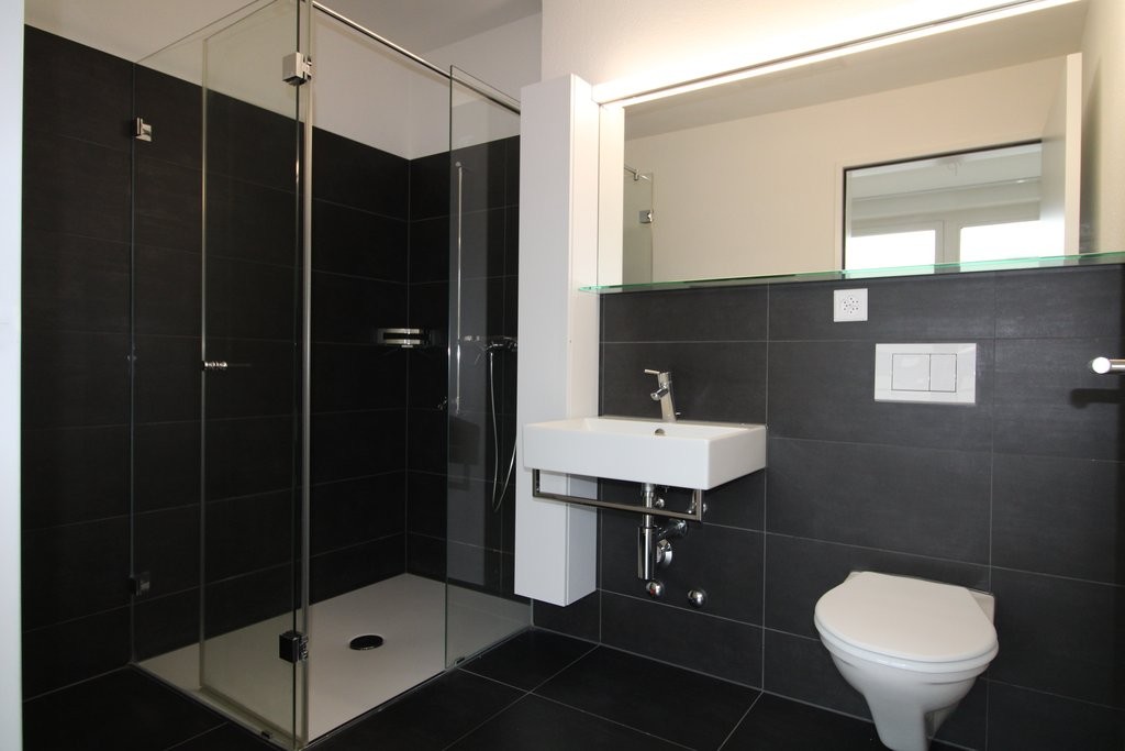 Dusche/WC mit bodenebener Dusche und einer Glastür