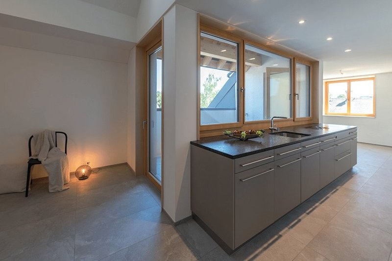 Entrée, Küche, Wohn- und Esszimmer mit grossformatigem Feinsteinzeug, Zimmer mit hochwertigem Parkett