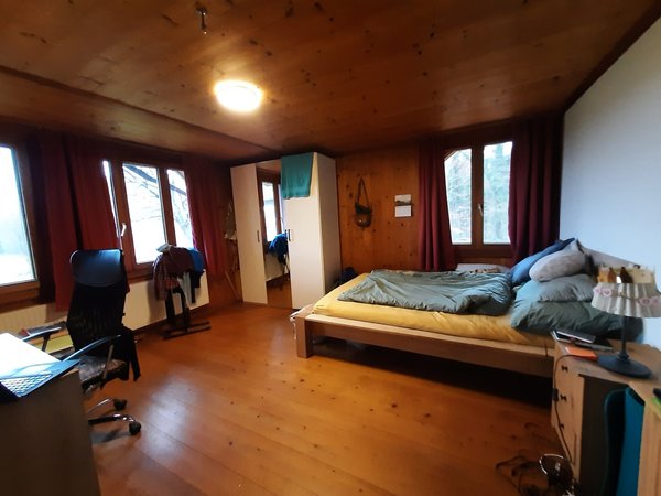 ...ist 17m2 gross und hell mit Fenster nach Süden/Westen mit Blick auf den angrenzenden Wald und die Berner Alpen.