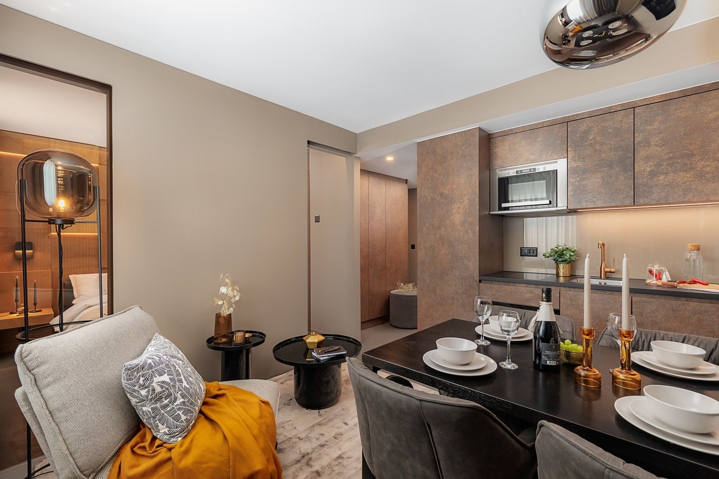 The bright and modern 1 bedroom apartment caters for all the daily needs. The open living area is furnished with exclusive furniture and a flat screen TV. The stylish interior and designer lamps give the apartment that certain something. The separate bedroom tempts with a snug double bed and provides the necessary privacy. Additionally, there is a fully fitted kitchen with a glass ceramic stove, microwave, coffee maker as well as pots, pans and crockery. The bathroom with a shower features bath towels, a hair dryer and toiletries.
