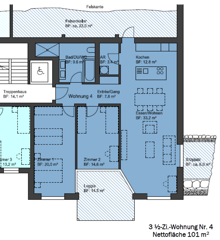 Eine 3 ½-Zi.-Wohnung an zentraler Lage mit Loggia, Sitzplatz und einem exquisiten Felskeller (neben dem eigentlichen Keller). Zusammen ergibt das eine Nutzfläche von über 140m2.