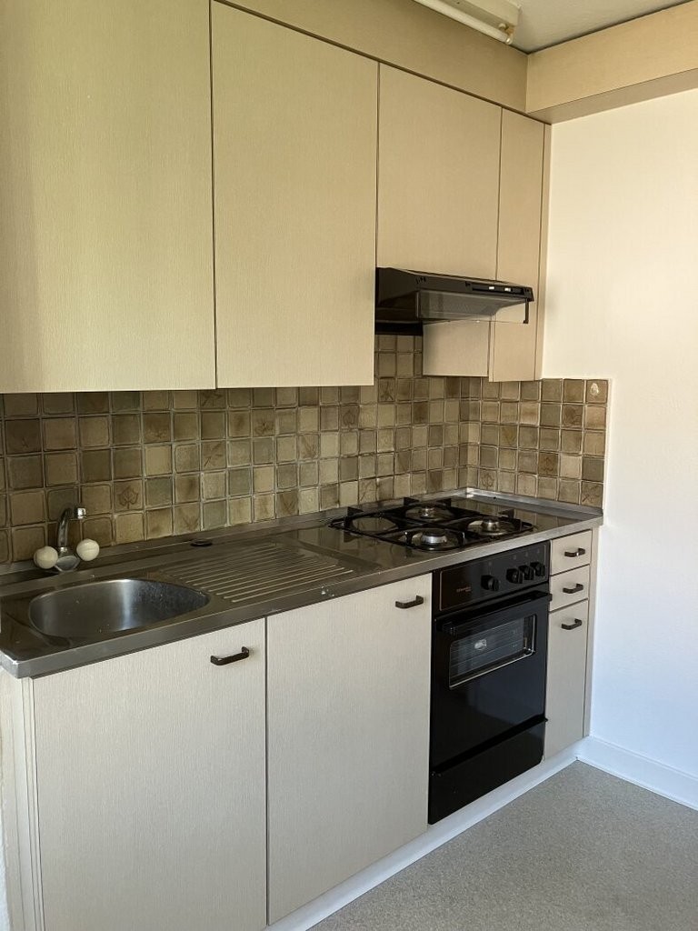 - abgeschlossene Küche mit Gasherd, Backofen, Dampfabzug, Fenster und PVC-Bodenbelag