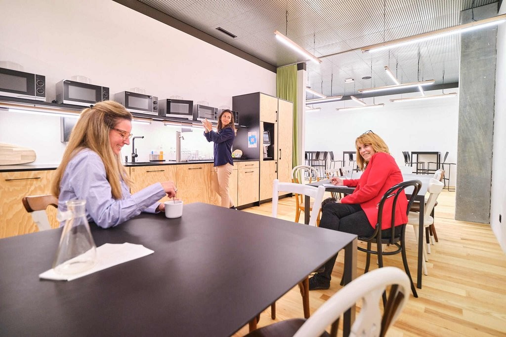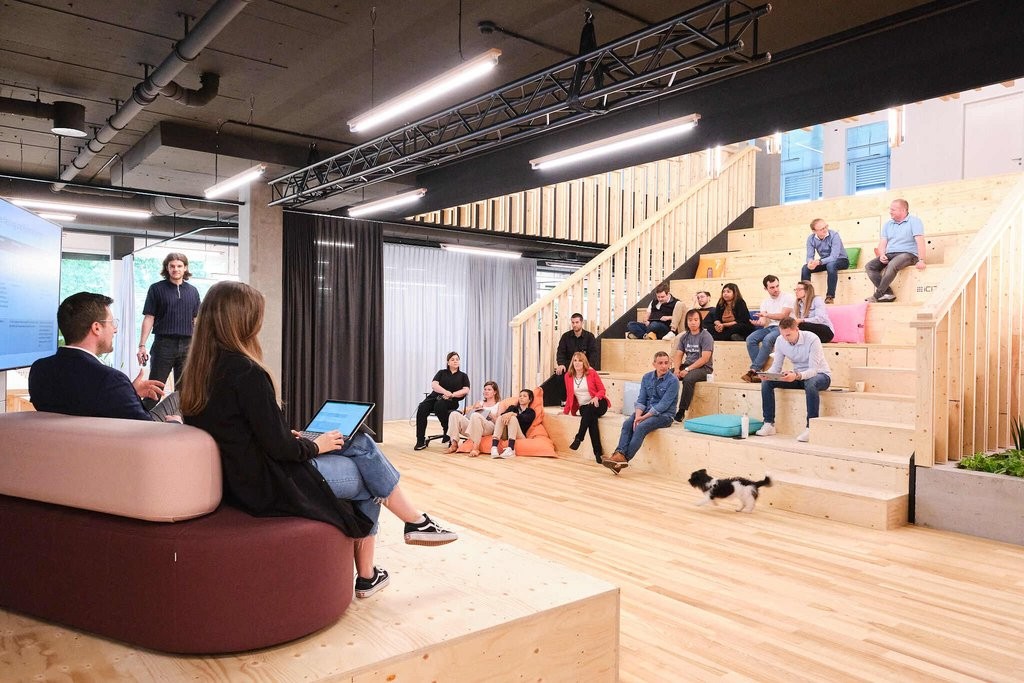 Inspirierende Räume: Moderne Ausstattung, grosszügige Community-Flächen und Kaffeemaschinen laden zum Austausch ein.