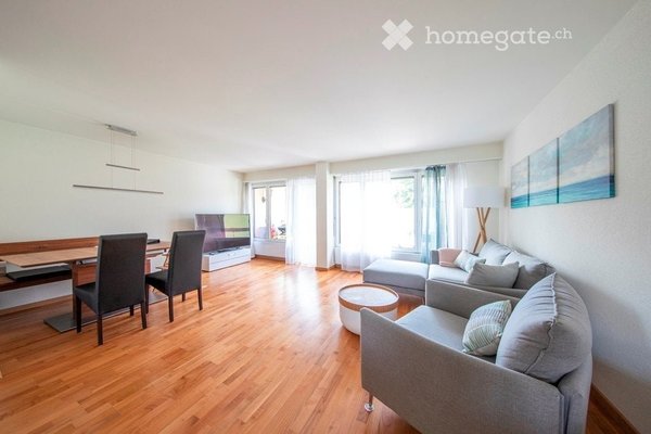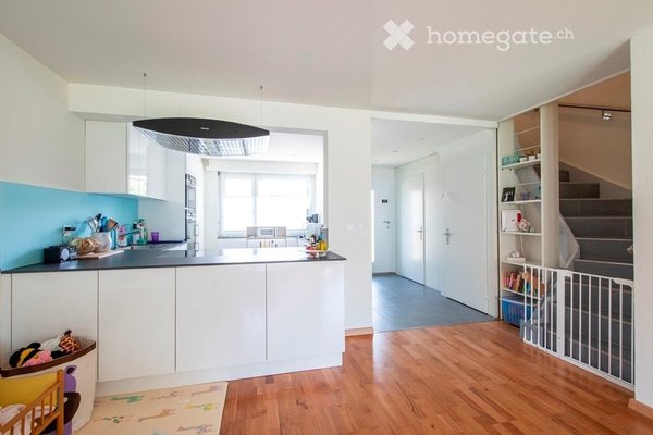 Erdgeschoss: Im hellen, offen gestalteten Erdgeschoss eröffnet sich ein grosszügiger Wohnraum mit grosser Fensterfront, mit direktem Zugang zum schönen und praktischen Aussenbereich mit Sitzplatz und Garten. Angrenzend an den Wohn-/Essbereich befindet sich die helle Küche mit stilvoller, grosszügiger Küchenkombination und modernen Apparaturen. Auf dieser Etage befindet sich auch ein Gäste-WC. Bodenbeläge: Keramikplatten und Parkett.