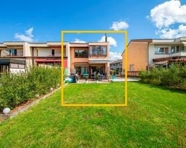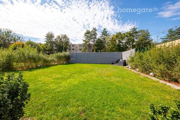 Garten: gesamte Gartenfläche mit Rasen, Gartenzaun und Sichtschutzbepflanzung, grosses Alu-Gartenhaus, Sitzplatz mit Zementsteinen und zwei grossen Sonnenstoren.