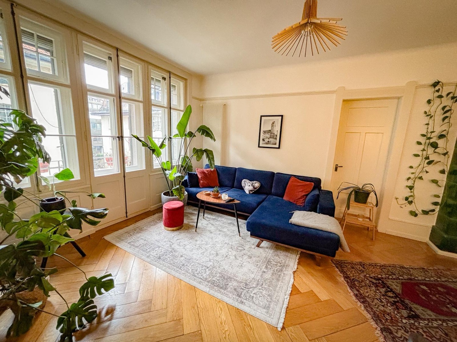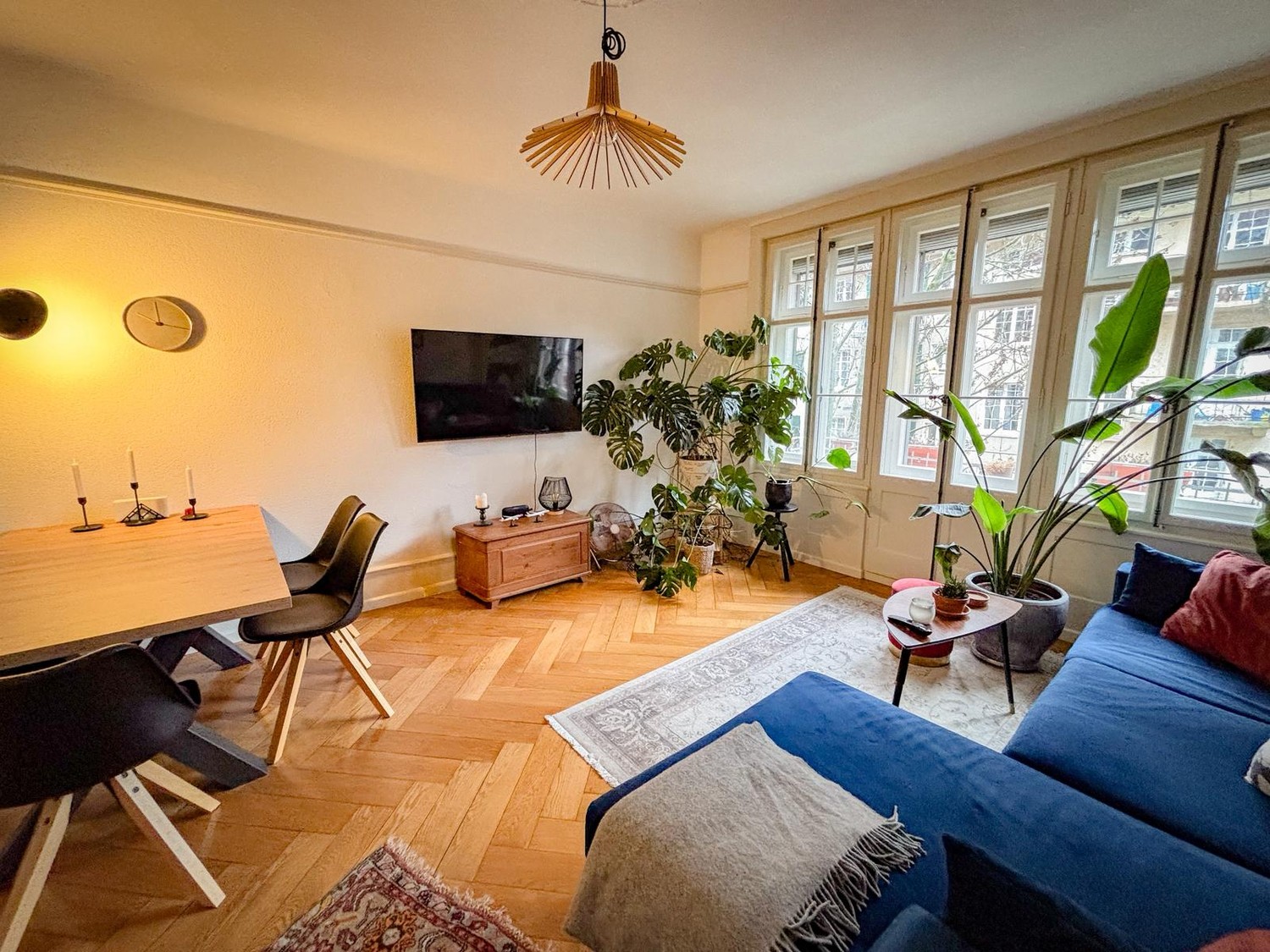 Großes, helles Wohnzimmer mit Parkettboden