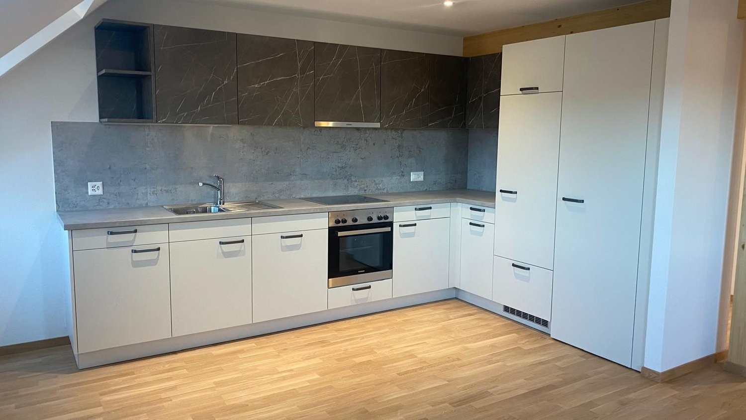 Cuisine entièrement agencée et ouverte avec colonne de lavage (lave-linge et sèche-linge), séjour et 2 chambres avec parquet, salle de douches/WC, galetas privatif avec accès direct depuis l'appartement.