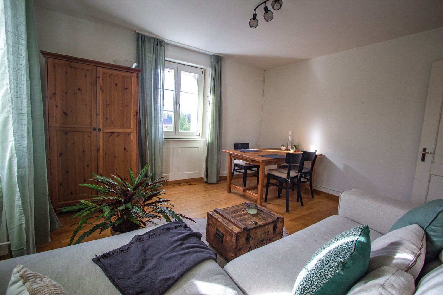 Wer es unkompliziert mag, ist hier genau richtig. Es gibt nicht viel zu putzen, da die Wohnung eher klein ist. Zudem kann man sich als WG super organisieren. Sie liegt im Grünen und es ist sehr ruhig hier. Die Nachbarn sind "chillig" und für einen kurzen Schwatz zu haben, aber kein Muss. Draussen hat es ein Velo-häusschen, welches man mit zwei weiteren Parteien teilt. Vor dem Haus hat es Parkplätze, die bei der Verwaltung oder Nachbarn angefragt werden können. Auch die Waschmaschine wird mit einem weiteren verheirateten Paar geteilt. Sie sind sehr sauber unterwegs und das ist ihnen auch wichtig.