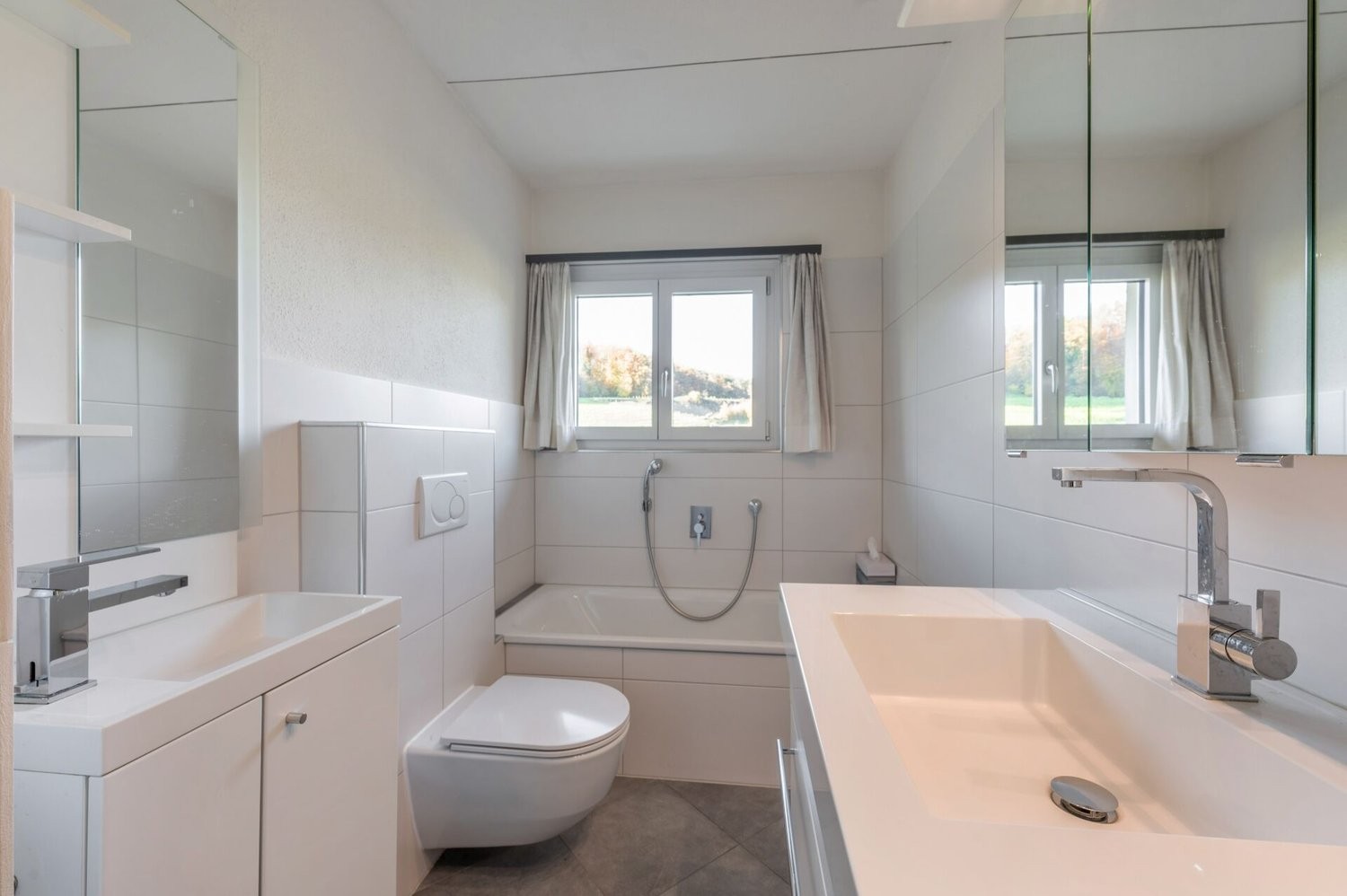 Der helle, einladende Eingangsbereich schafft nicht nur einen freundlichen Empfang, sondern bietet auch praktischen Stauraum für Jacken und Schuhe. Weiter erwarten Sie im Erdgeschossbereich drei vielseitig nutzbare Arbeits- und Schlafzimmer, von denen eines direkten Zugang zum ensuite Nassraum mit Badewanne, zwei Einzelwaschtischen und Toilette bietet. Die geschlossene Küche überzeugt mit großzügiger Ablagefläche und einer herrlichen Aussicht ins Grüne - hier macht Kochen besonders Freude. Der offen gestaltete Wohn- und Essbereich beeindruckt mit einem Warmluft-Cheminée mit einer hochwertigen Kupfereinfassung, die eine warme und einladende Atmosphäre schafft. Vom Erdgeschoss aus gelangen Sie zudem auf den gedeckten, lauschigen Sitzplatz, der mit einem Aussencheminée für gemütliche Stunden im Freien ausgestattet ist.