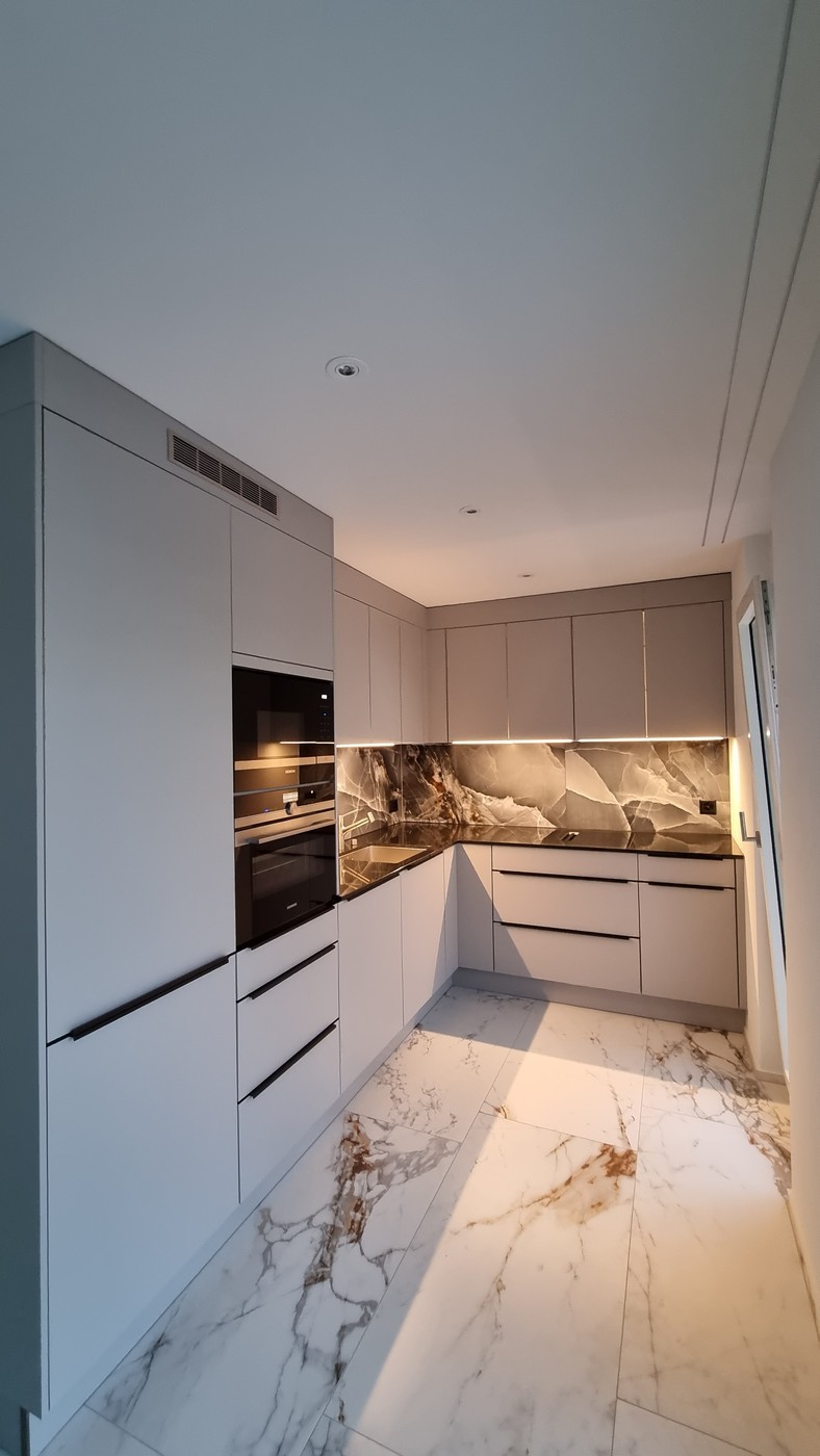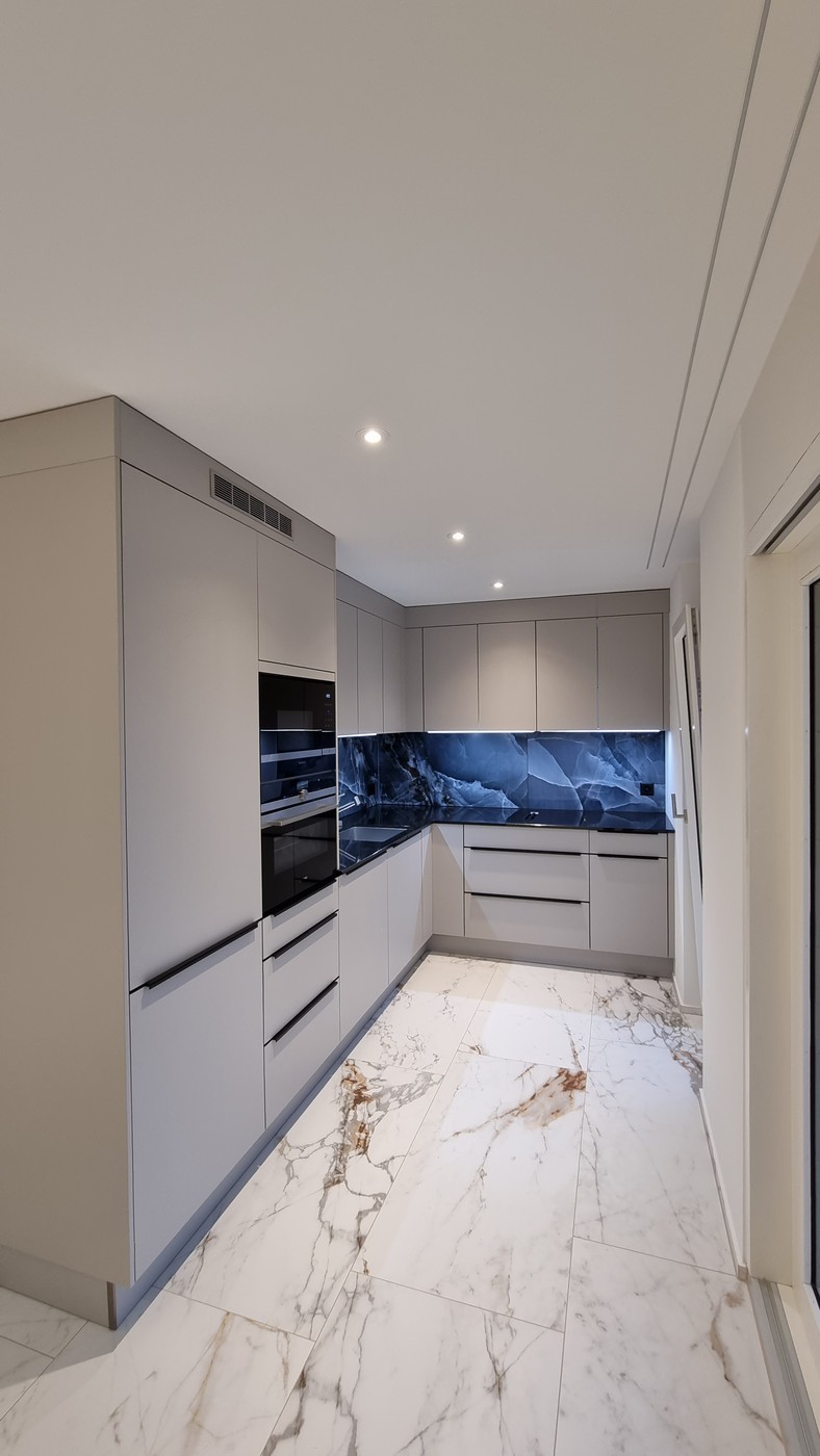 Moderne Annehmlichkeiten wie eine Gegensprechanlage, ein privater Aufzug mit direktem Zugang von der Tiefgarage zur Wohnung und eine hochmoderne Küche mit gedämpften Schubladen und Schranktüren erwarten Sie hier. Die verstellbare LED-Beleuchtung in der Küche ermöglicht Ihnen das Anpassen von Helligkeit und Farbe per Touch.