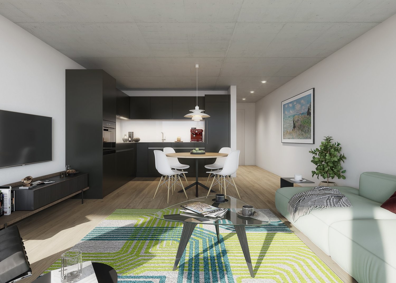Ein besonderes Highlight bildet die Photovoltaikanlage auf dem Dach, die nachhaltige Energie liefert und den zukunftsorientierten Anspruch des Gebäudes unterstreicht. Ergänzt wird das Energiekonzept durch eine Luft-Wasser-Wärmepumpe für umweltfreundliches Heizen und Warmwasser. In den Wohnungen sorgt Freecooling für angenehme Temperaturen an warmen Tagen - ganz ohne aktive Kühlung. Die Fussbodenheizung schafft ein behagliches Wohnklima mit gleichmässiger Wärmeverteilung.